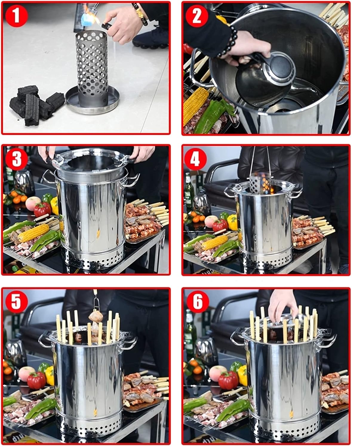 Barbecuing is an essential leisure activity in the four seasons. In summer, you can have a barbecue and picnic under the shade of the trees. It was so fun to watch the kids fly kites and eat barbecue. In winter, you can call your family and friends to hold a party, bring out the warm heat from the grill grill, and cook a delicious barbecue.Material: Stainless steelFeatures: 360-degree circular grill can accurately control the temperature, the outside is scorched and the inside is tender, not easy to pastesize: 33*42CM/Can grill 28 skewersFor: CharcoalBarbecue time referenceFood type/baking time:Beef, lamb (various skewers)/4-7 minutesPrawns, fish and similar categories / about 5 minutesGreen peppers, garlic and similar categories / about 5 minutesOysters, scallops and similar types/6-10 minutesMedium chicken wings, chicken legs, ribs/12-20 minutesCorn, sweet potatoes / about 15 minutesPack: 1*Charcoal grill, 5*AccessoriesNote: 1/3 of water must be added to the dripping oil tray, not dry boil