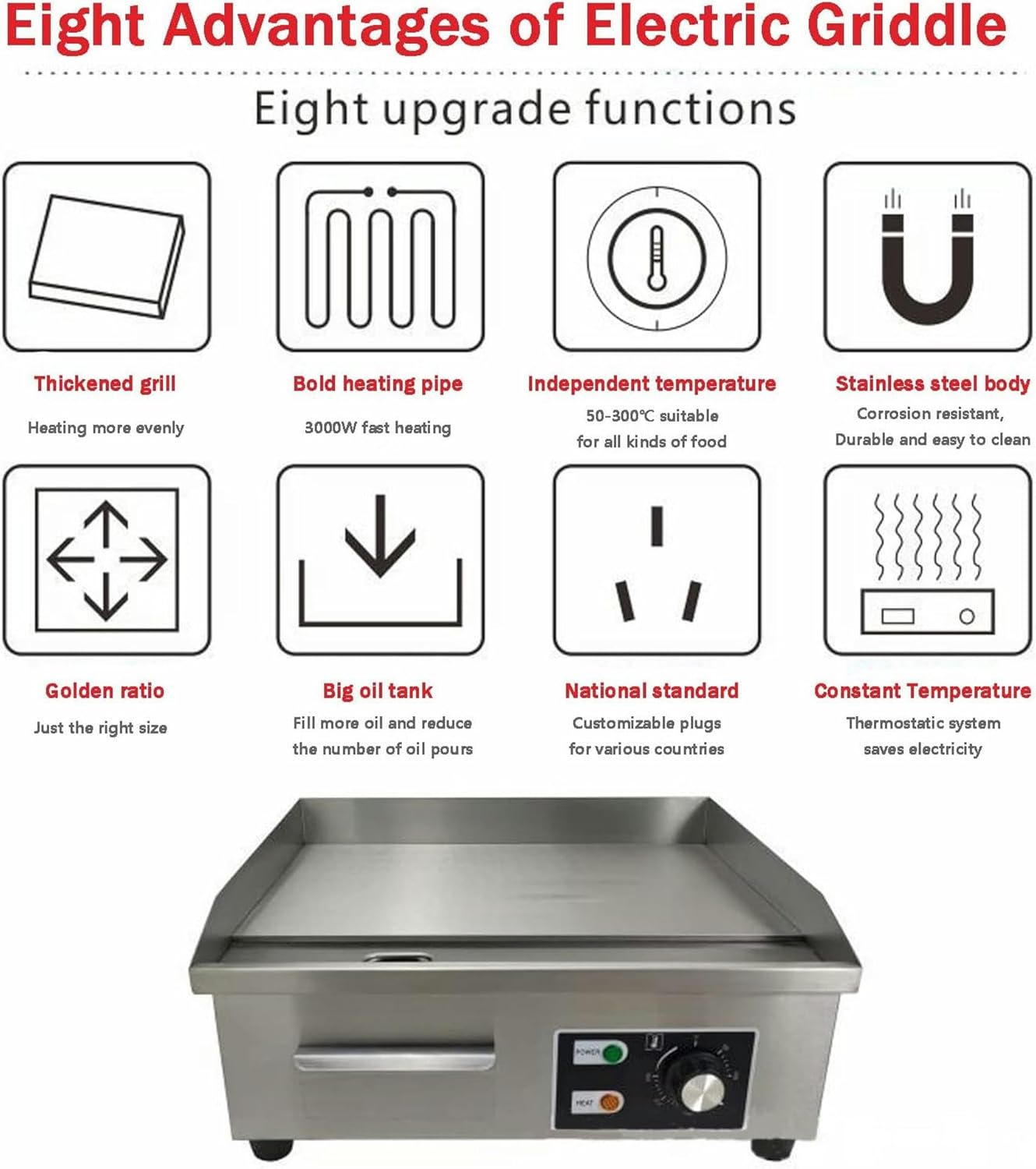 Model Number:Powerful Efficient Griddle with Great Cooking PerformanceGreat for whipping up bacon, burgers, cheesesteaks, and more at your busy snack bar, concession stand, or restaurant, this countertop griddle is an efficient and durable addition to your kitchen. Independent controls and versatile features allow you to customize this unit to meet your needs!Commercial Electric Griddle: Uniform Heating & Large Cooking AreaOur commercial electric griddle is very suitable for families or restaurants. It can cook a variety of foods and save you time. Stainless steel is durable and easy to clean. Accurate temperature control makes the heating tube heat evenly and the food more delicious. Various intimate details - oil drip hole, oil collecting box, heat dissipation hole, etc. at the same time, it is also equipped with accessories to provide a high-quality foundation for your use. Come and choose us.Wide ApplicationCan be used at home or in commercial places,Perfect for processing pancakes, crispy bacon, grilled cheese,full breakfast, fried dishes, omelet, pizza, steak, burger.Package Content:1x countertop griddle grillTIPS: Before using the griddle for the first time, using dishwashing liquid and water to clean the cooking plate, then heating. Finally, apply a layer of oil to avoid the plate to be rust.