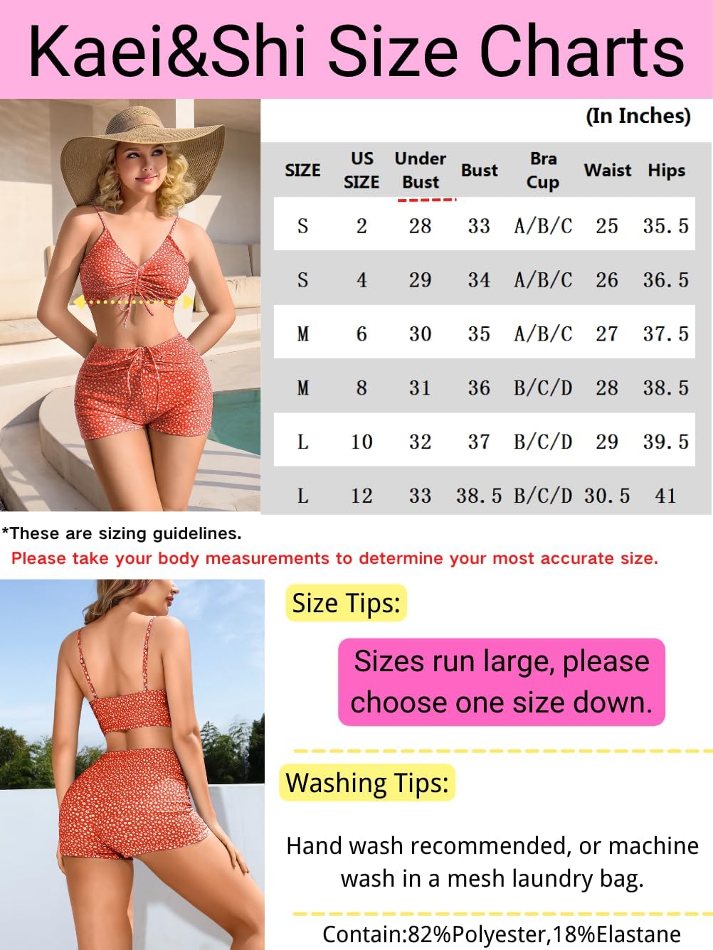 #Welcome to Kaei&Shi store! #About Size: Please check the size chart on the photo gallery.#FAQ: Q: Is it see-through when wet? A: No, it isn't. Q: Does it provide adequate coverage for the bottom?( A: Yes, it does. Q: Is this material comfortable? A: Yes, this swimsuit is made of lightweight and breathable fabric. Skin friendly. Q: Is there padding in the top? A: Yes, it's. Q: Does the color fade with time after multiple washings? A: The material is high quality. So it would not fade. Q: How many items are included in the product? A: It comes with 1 bikini set. #Washing Instructions: Machine washable in laundry bag. Wash in cold water, please do not use bleach soak.