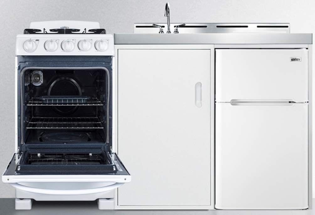 Summit Appliance ACK60GASW 60" Wide All-in-One Kitchenette with 115V 4-Burner Gas Range, Refrigerator-Freezer, Sink, Cutting Board and Cutlery Storage, and a Storage Cabinet Key Features - Complete all-in-one convenience with a refrigerator-freezer, gas range, sink, and storage compartment in just 60" - Includes RG200WS 4-burner gas range, 2.3 cu.ft. oven with adjustable racks, and is LP convertible (kit included) - Includes CP34W 3.2 cu.ft. ENERGY STAR certified refrigerator, adjustable glass shelves, door storage, and a freezer compartment - Convenient lower cabinet with adjustable shelf lets you store dry goods - Environmentally friendly design without ozone-damaging chemicals Specifications - Height of Cabinet: 42" - Width: 58.63" - Depth: 23.63" - Depth with door at 90°: 43.25" - Capacity: 3.2 cu.ft. - Defrost Type: Cycle - Door & Cabinet: White - US Electrical Safety: ETL - Canadian Electrical Safety: ETL-C - Other Energy Info: 1.1A refrigerator - Voltage/Frequency: 115V AC/60Hz - Refrigerator Included: CP34W - Refrigerator Door Swing: RHD - Adjustable Shelves: Yes - Shelf Type: Glass - Shelf Qty: 1 - Crisper Qty: 1 - Crisper Finish: Transparent - Crisper Cover: Glass - Full Door Shelves: 2 - Can Storage: Yes - Thermostat Type: Dial - Interior Light: Yes - Refrigerant Type: R600a - Refrigerant Amount: 1.16 oz. - High Side PSI: 250 - Low Side PSI: 88 - Cooking Type: Gas Range - Number of Burners: 4 - Cooktop Controls: Dial - LP Convertible: Yes - Range Included: RG200WS - Oven Included: Yes - Weight: 280 lbs. - Shipping Weight: 320 lbs.