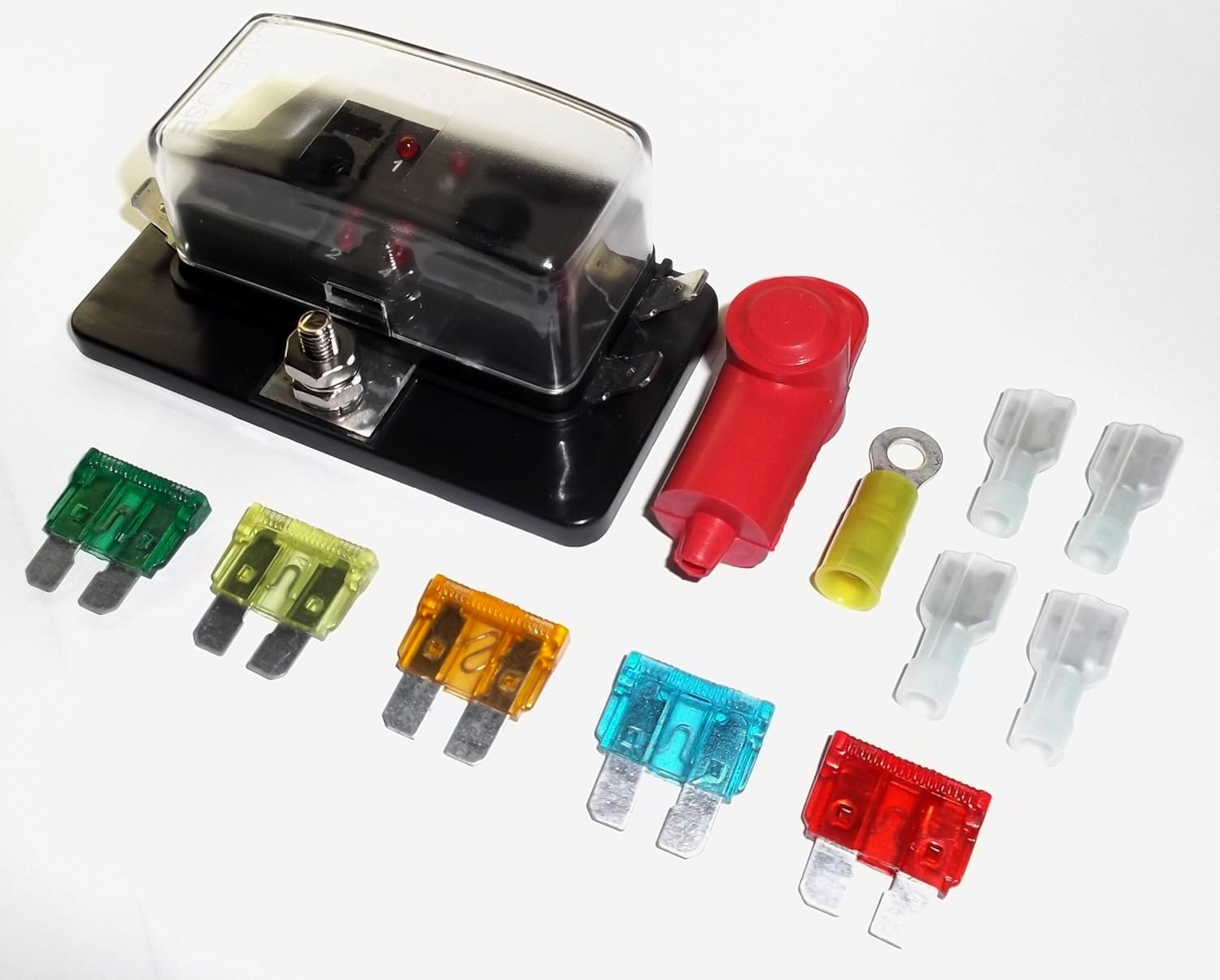 The Fastronix complete 10 circuit fuse panel includes everything you need to add protected accessories to any car, truck, motorhome, trailer, and off road vehicles. The panel mounts with 4 recessed holes.The 6 circuit kit includes the following fuses: (2) 5A, (2) 10A, (3) 15A, (3) 20A, (2) 30A, 10 female spade nylon crimp terminals which connect your accessories to the fuse panel, a nylon main power crimp terminal to connect the fuse panel to your power source, a rubber terminal boot to protect your main power wire from incidental shorting, and a clear cover to protect your fuses from dust, dirt and debris. The convenient LED indicators can easily alert the user when a fuse has blown without the hassle of pulling multiple fuses. Fuse panel is rated to 100 total amps. As a guideline dedicate 10 amps per circuit. NOTE: wire is NOT included with this kit.