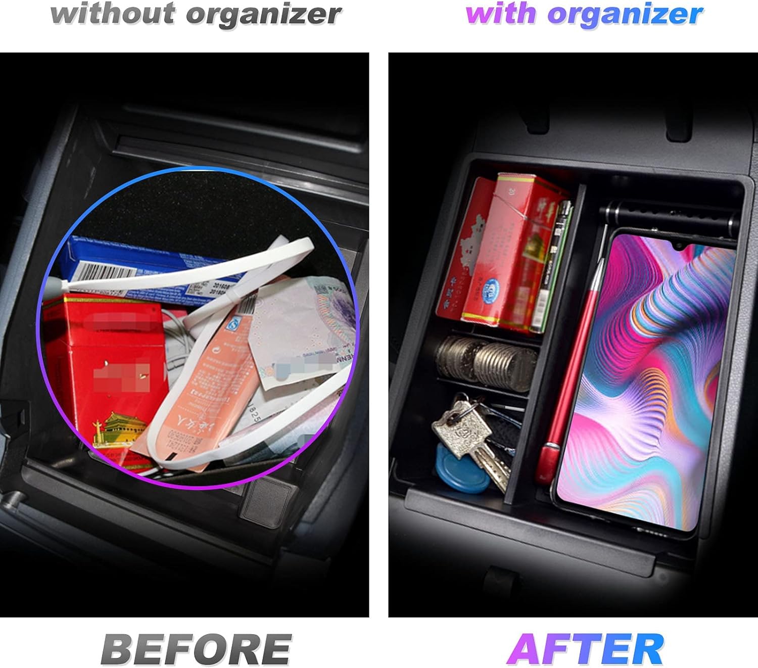 Notice:The Cup Holder Tray measures 3 inches in the single cup position! These trays are Only for "Limited Trim / Hybrid SEL Convenience Trim" that has A Full Button Wire Console!!! Not for other console with a shift bar!!! Please compare our central control pictures before purchasing!!! SXCY Under Console Tray+ Armrest Console Organizer Fit for 2025 Hyundai Tucson AccessoriesUpgrade your driving experience with the perfect fit! The SXCY for 2025 Hyundai Tucson Center Console Tray is designed specifically for your 2025 Hyundai Tucson Limited Accessories.Material & Color:Material: High-quality ABS Plastic; TPE Material only for under console cupholder trayColor: Black Package Includes:1 x Armrest Organizer Tray+1 x Under Console Cupholder Tray for 2025 Hyundai Tucson Accessories 1 Set Anti-Slip Rubber Mats Key Features: Perfect Fit: Designed specifically for your 2025 Hyundai Tucson Armrest Box Interior Area, this tray fits like a glove, seamlessly blending into your console layout. Secure Grip: Removable rubber inserts keep your items firmly in place, preventing annoying shifts during your drive. Effortless Installation: Easy to install, this tray instantly upgrades your 2025 Tucson console's functionality. Enjoy quick access to storage compartments without the hassle. Explore Armrest Interior Area: A specially designed coin exclusive slot allows for easy access to your coins while it remains securely stored in the tray. Optimized Organization: Maximize your console space while keeping everything in order. Say goodbye to clutter and hello to extra upper storage room in your armrest box! Streamlined Classification: Find your essentials with ease. Keep you are safety while driving. Separate compartments ensure everything has its place, from mobile phones to cards and coins. Enhance your driving pleasure with this SXCY 2025 Tucson Console Tray. Keep your 2025 Hyundai Tucson tidy, organized, and ready for any journey!