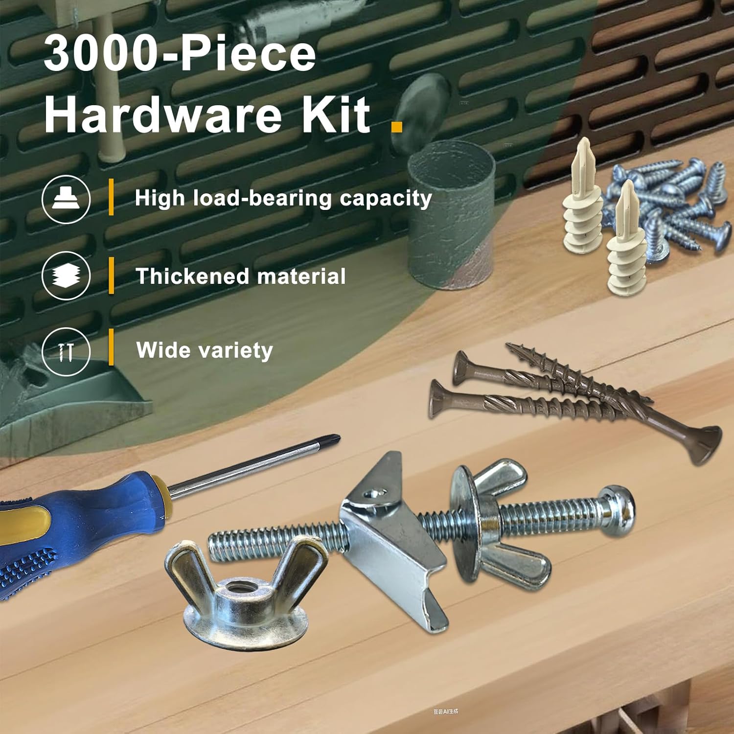 • 【Multi-Size Options】3,000 pieces and 45 different hardware sizes: 300 pieces in Anchor and Screw - 7 sizes of drywall anchors , Pan head drywall screw and 1 set hollow wall anchor with wing nut and machine screw. 600 pieces in Screws - 9 sizes of pan phillips tapping screw and 7 size of flat trox deck screws. 2,100 pieces of Nails - 11 sizes of flat nails and wire brads, 1 drill bit and 1 screwdriver.