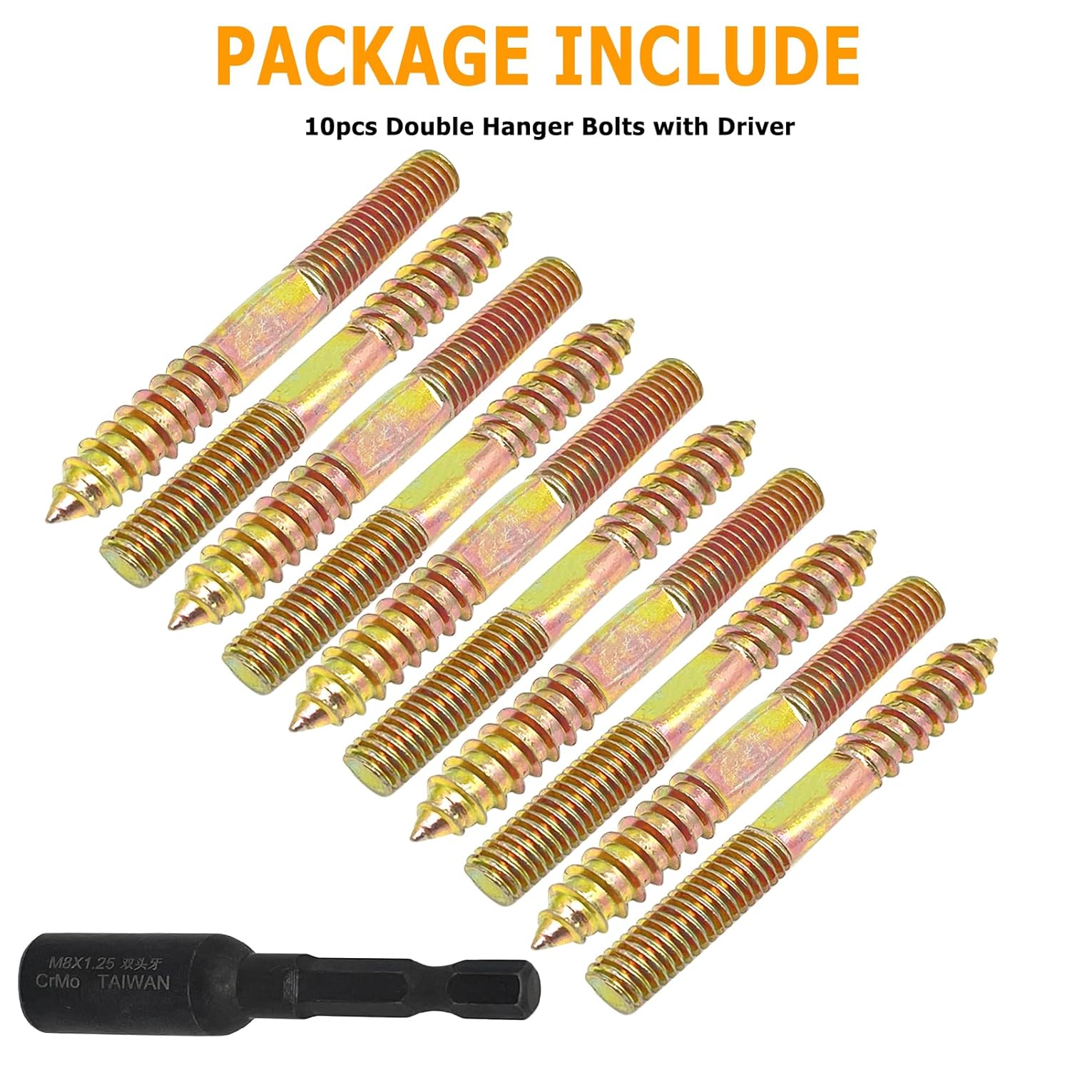 Feature: Galvanized steel provides increased protection, excellent corrosion and rust resistance, and long service life. These threaded bolts perform well when inserted into pre-drilled holes and are perfect for overhead mounting when driven into wood or softer layers. Self-attacking design, easy to install,well-made , easy to screw and won't slip loose. Wood dowel screw is suitable for connecting individual wooden parts,is a very ideal sofa accessories. Product Specifications: Material:Iron,Zinc-plated surface. Hardness:4.8 Grade. Thread Diameter:M8. Total Length:35mm/1.37". Driver Size:M8x1.25mm. Driver Handle:1/4Inch. Package Include: 10pcs Double Hanger Bolts with Driver.