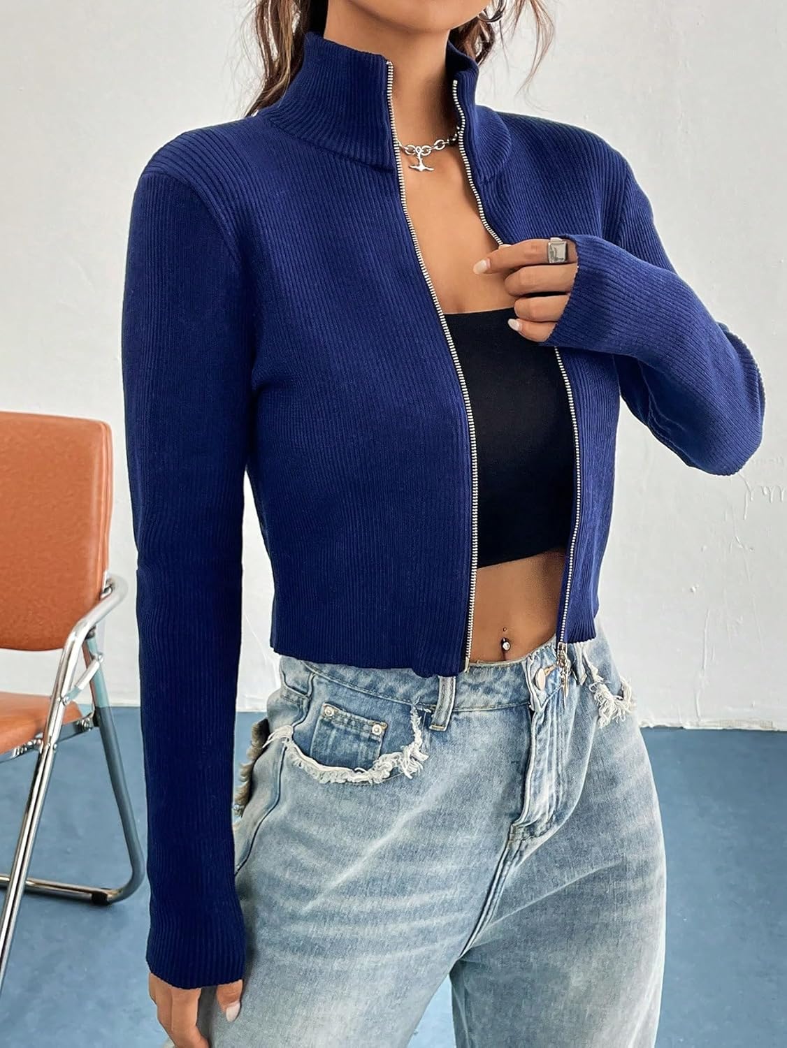 SBicep Length : 10.2 inchBust : 30.7 inchLength : 16.9 inchShoulder : 14.2 inchSleeve Length : 22.4 inchMBicep Length : 10.8 inchBust : 32.3 inchLength : 17.3 inchShoulder : 14.6 inchSleeve Length : 22.8 inchLBicep Length : 11.6 inchBust : 34.6 inchLength : 17.9 inchShoulder : 15.2 inchSleeve Length : 23.3 inchXLBicep Length : 12.4 inchBust : 37 inchLength : 18.5 inchShoulder : 15.7 inchSleeve Length : 23.8 inchColor: Navy BlueStyle: CasualPattern Type: PlainDetails: Zipper,Rib-KnitNeckline: Stand CollarLength: CropSleeve Length: Long SleeveSleeve Type: Regular SleeveFit Type: Regular FitFabric: Slight StretchMaterial: FabricComposition: 100% PolyesterCare Instructions: Machine wash or professional dry cleanSheer: No
