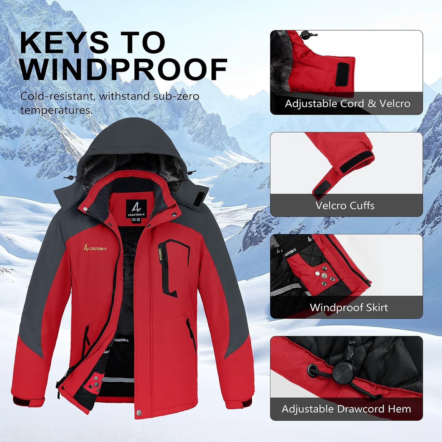 • 【WINDPROOF & FULL PROTECTION】: 1.Wear-resistant windproof shell has strong windproof and warmth;2.Detachable hood with adjustable drawcord helps fend off wind and snow;3.Windproof skirt, Velcro cuffs, drawcord hem seal in warmth tightly, preventing cold air from entering;4.Stand-up collar protects your neck from gusts, full zipper closure boosts wind resistance further—all carefully designed for better windproof effect.