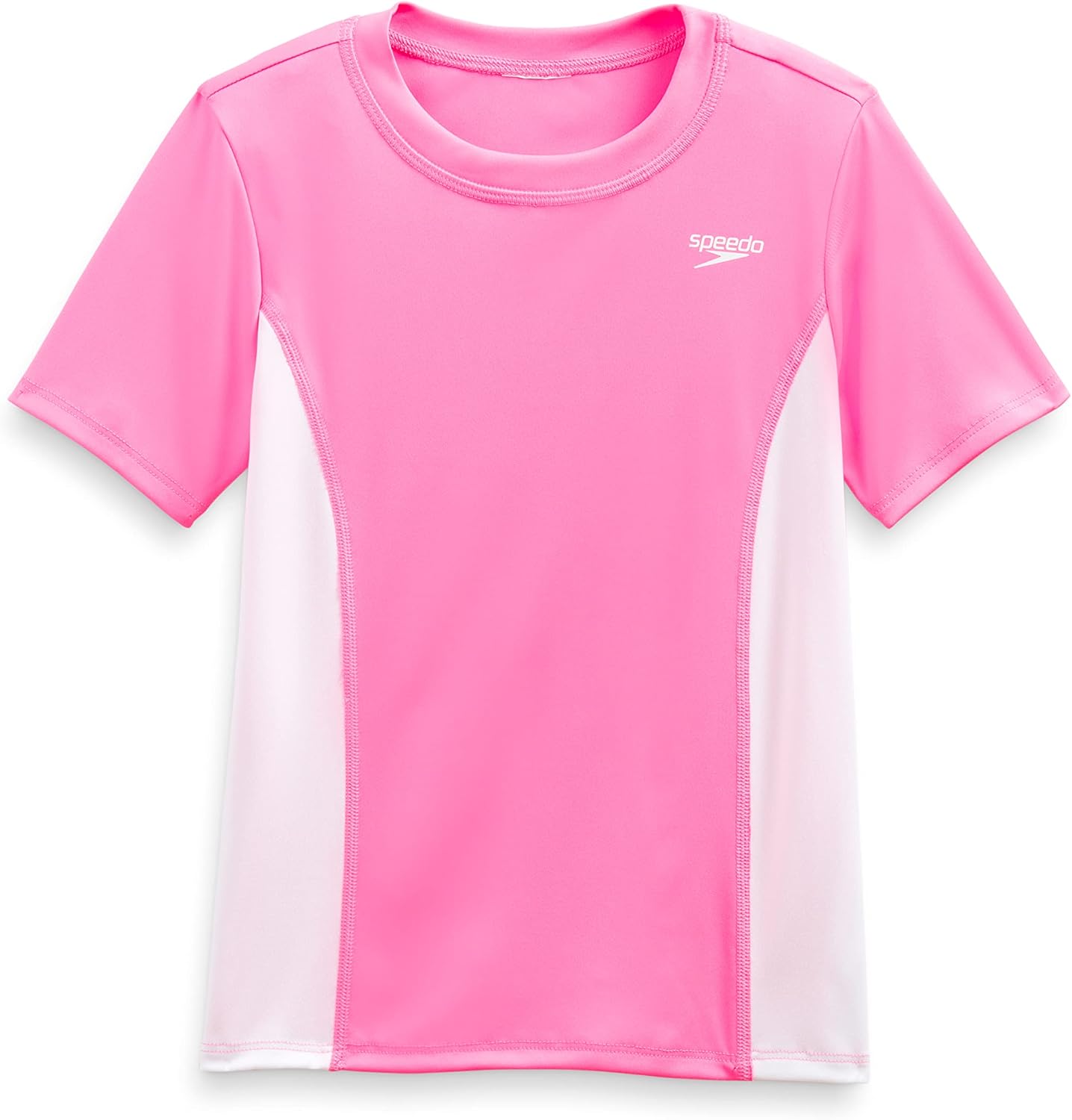 A playful print has found its way to the sleeves of this sporty swim top. Durable fabric offers superior chlorine resistance while blocking harmful UV rays. Raglan sleeves offer enhanced mobility; contrast stitching adds a fun color pop.