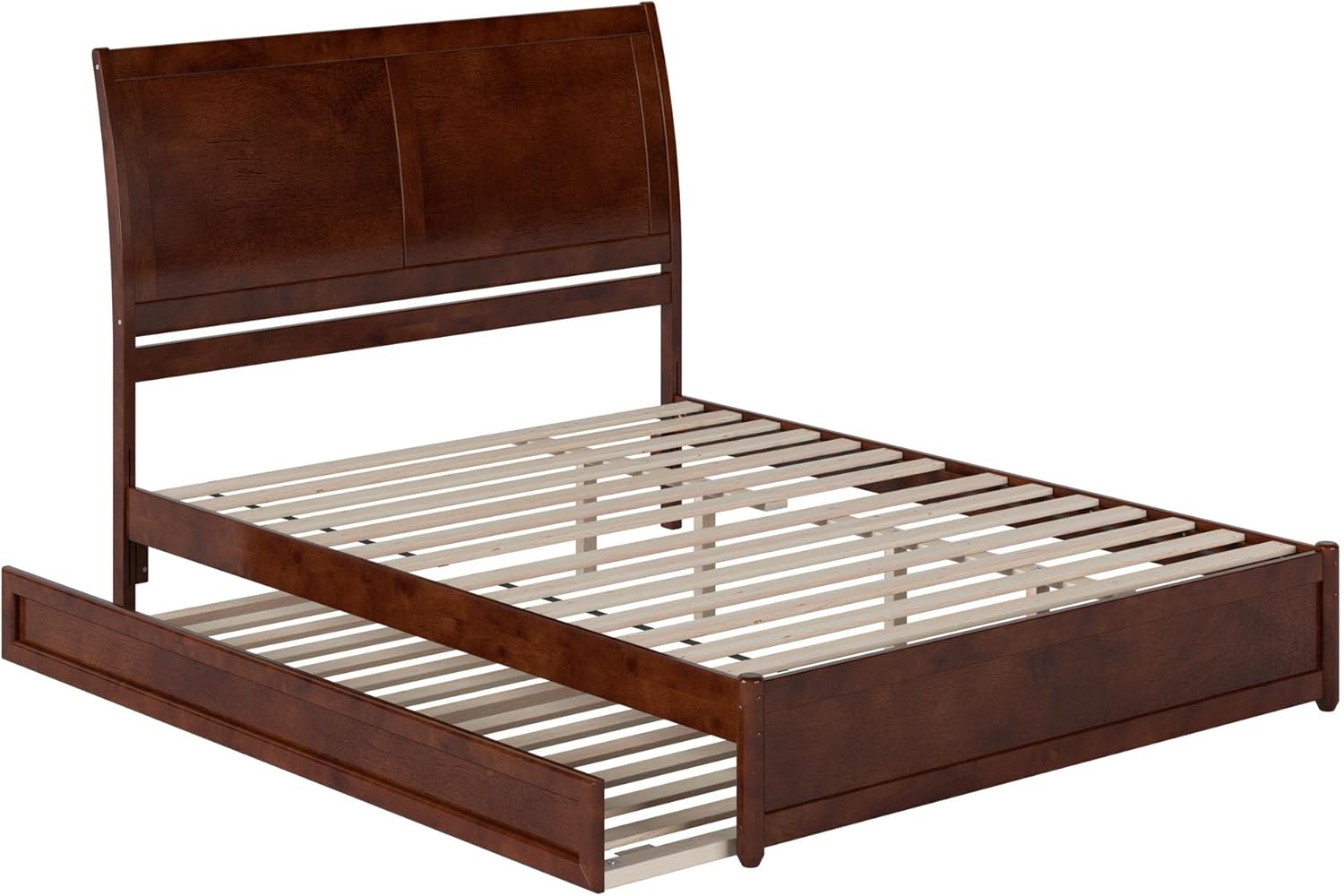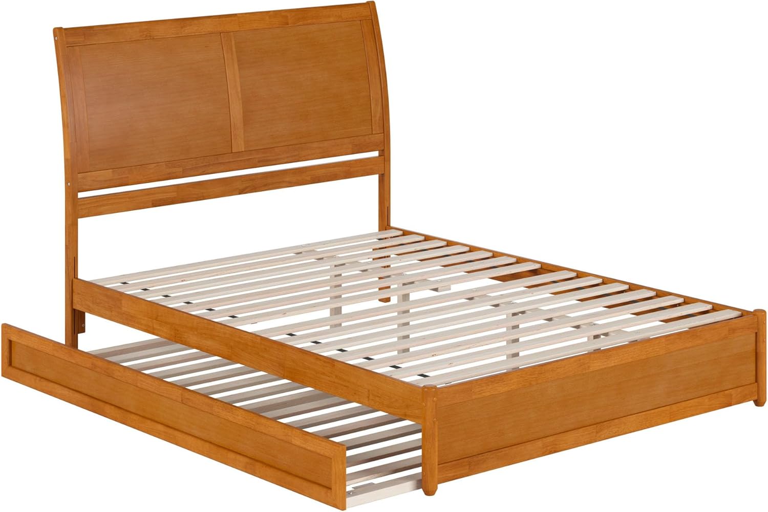 Enhance your bedroom with the sleek sophistication and contemporary design of the Andorra Platform Bed with Panel Footboard and Twin XL Trundle. The clean lines and subtle sleigh of the solid wood headboard offer a fresh aesthetic that is minimalistic and elegant. Find a color to match your space with finishes available in White, Walnut, and Light Toffee. Experience ultimate comfort on the robust frame, complete with sturdy wood slats that provide excellent mattress support, eliminating the need for a bulky box spring. The Andorra comes complete with a convenient Twin XL trundle bed that neatly tucks under the frame and makes hosting your guests simple. Stay connected with the attachable USB charger that will keep your devices charged and close at hand. Find a suitable fit for you and your space, with Twin, Twin XL, Full, Queen, and King sizes available. The Andorra Platform Bed with Panel Footboard and Twin XL Trundle is the ideal addition to elevate your bedroom to new heights of style and functionality.