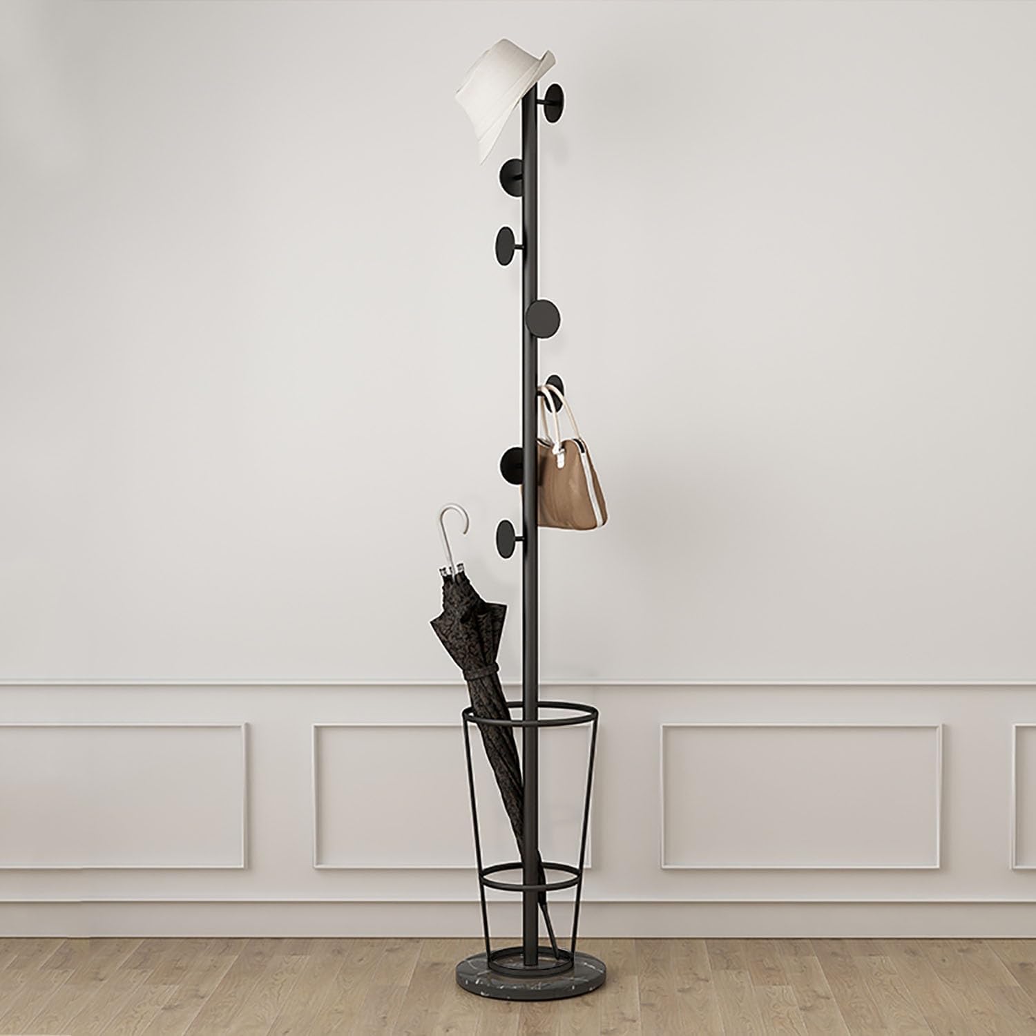 Product Description:Product Name: Umbrella holder for entryway/coat rack stand, umbrella stand indoorMetal Material: High-quality iron frame + marble baseHook Category: Branch hook (B), round cake hook (C)Color Classification: Black+black Base, Gold+black Base, Black+white Base, Gold+white BaseSize Classification: 33×33×170cm(13×13×66.93in)Packaging Details:\u200b\u200b 1 * Umbrella holder for entrywayNotice:The above dimensions are all measured manually, there may be an error of 1-2 cm, please understand.