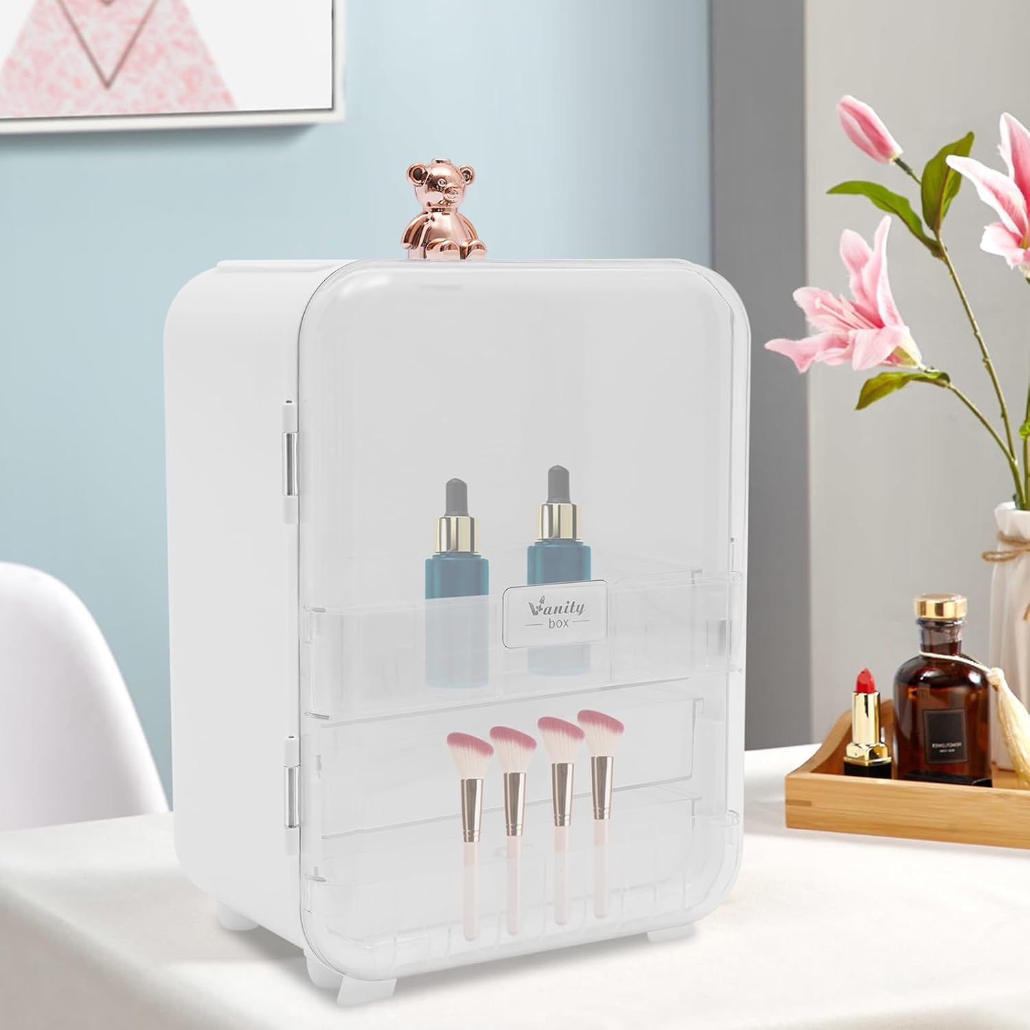 A tidy and organized environment can enhance our sense of relaxation and happiness in everyday life. When faced with clutter, an organizer becomes necessary. This spacious makeup storage box, crafted from PP with an electroplated bear design, is both durable and capable of holding up to 20lbs. It helps you keep your space organized and eliminates desktop chaos, leading to a more joyful life.