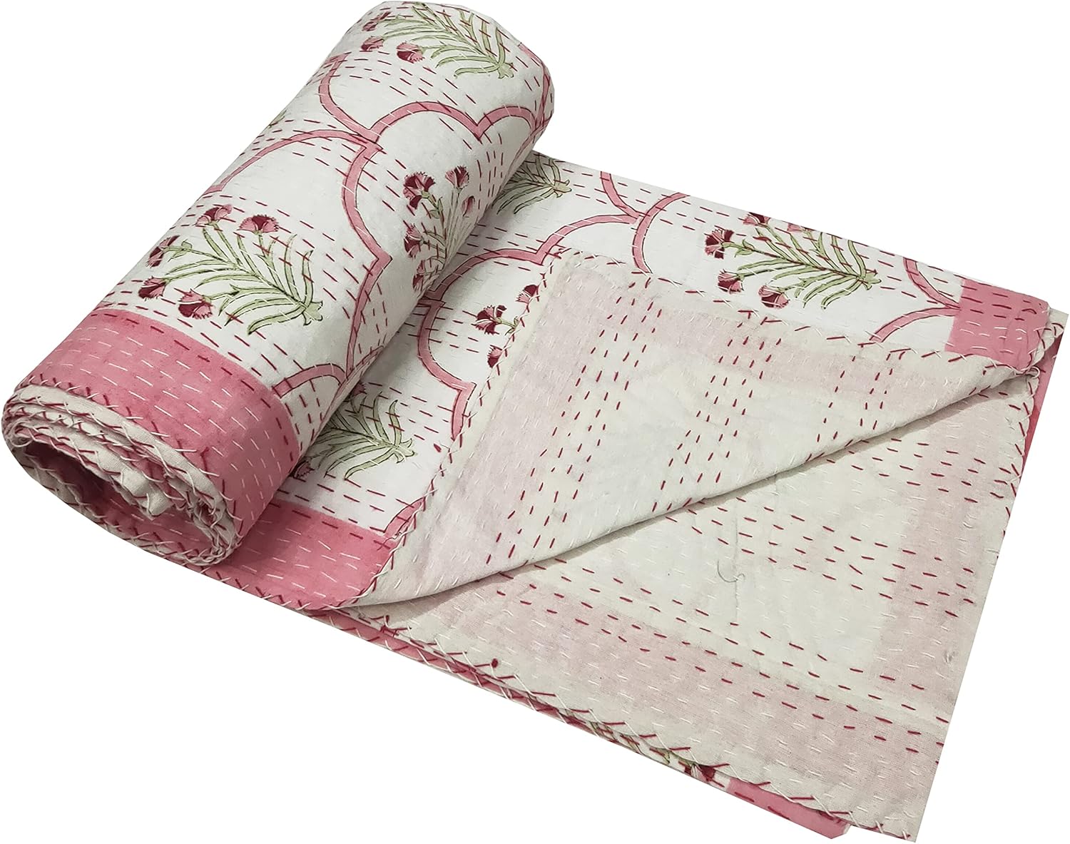 A beautiful creation to give your home a traditional yet authentic colorful look with this beautiful kantha quilt blanket or throw which can also be used as handmade tropical Kantha bedspread bedding. This piece is of art is completely hand stitched by Women artisan in Rajasthan, India. The entire quilt is hand embroidered with end number of straight running stitches to create a unique product, one of it's kind.These quilts are famed and admired due to their Kantha work. They have different beautiful warm and charming colors, designs and patterns on either side which gives a distinct look.