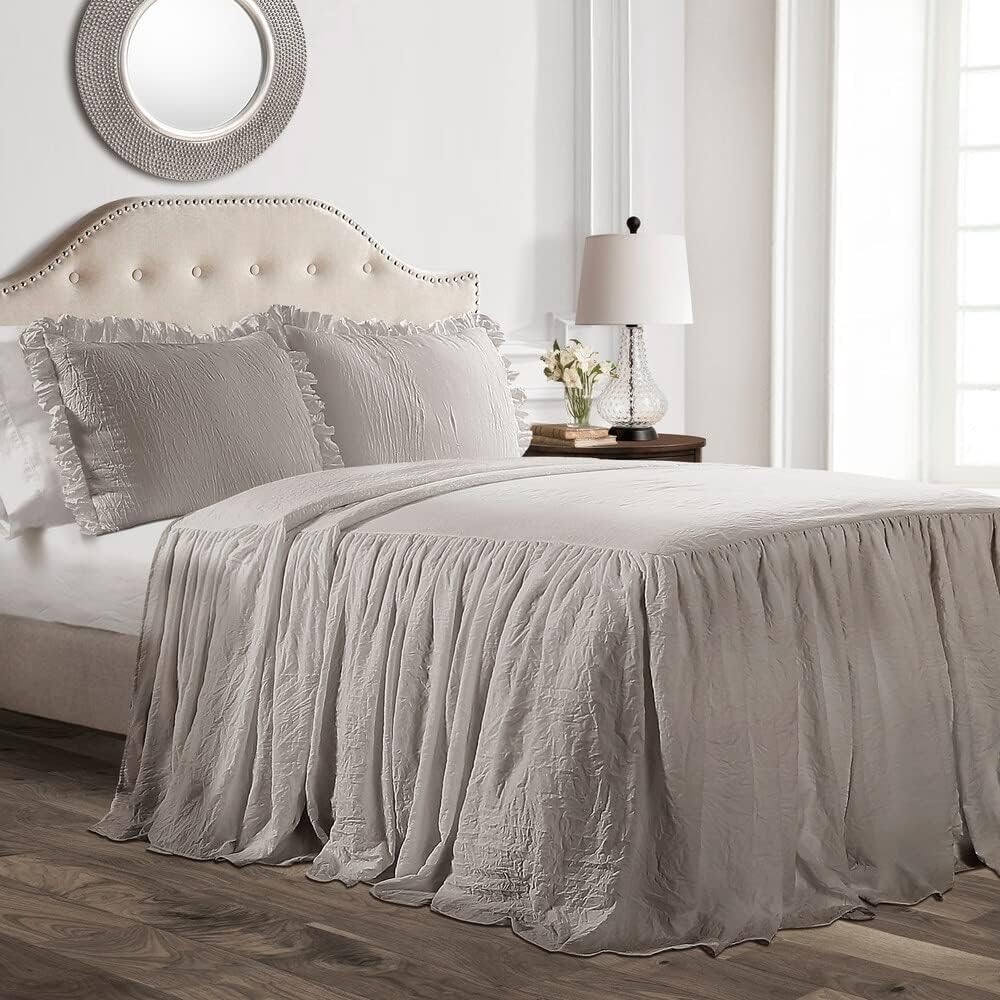 Complement your charming bedroom style with the Ruffle Skirt Bedspread Set. This solid color set is soft and luxurious feeling with a beautiful ruffle detail, fitting perfectly with your selected bedding sets. The crinkle microfiber fabric is oh so soft and lightweight for your total comfort. Because it's lightweight, it's suitable for layering and can be used for spring and summer. This generously sized 3-piece bedding set includes 1 bedspread and 2 standard pillow shams. Create the sweet serene bedroom of your dreams. This charming and flowy design combines long elegant ruffles that drape downward to the floor, offering the appearance of a bedskirt, giving your bedroom an airy yet dramatic look. Cottage, farmhouse and even bohemian styled homes can welcome this bedspread set easily into their delicate decorating themes. Each sham is edged with a soft, pleasing ruffle. Because the fabric is meant to fall to the floor, you won’t need to add a separate bed skirt or dust ruffle. It’s all one piece of fabric, so you can make your bed easily without the need for additional bed sheets. Easy to care for, you simply machine wash cold on gentle cycle and tumble dry this bedding set. Please refer to label for full care instructions. This product is STANDARD 100 by OEKO-TEX® certified, which means the fabric, dyes and all components have been tested in an independent laboratory and certified against a list of more than 350 harmful substances. Please refer to label for full care instructions.