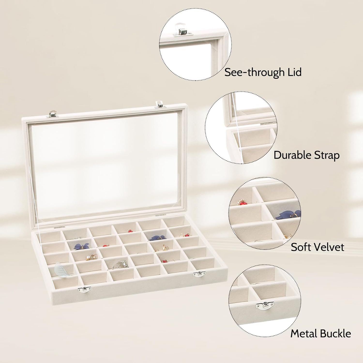 Jewelry Organizer Box Clear Lid Stackable Display Tray elegant jewelry storage display tray perfect for jewelry necklace rings earrings, rings storage, neatly storing and organizing all of your precious jewelry. *Adds a stylish accent to your dresser or vanity. *A perfect gift for anyone who wants their jewelry to stand out! Durable Construction: this jewelry box is constructed with sturdy composite board warped in premium Linen with removable compartment dividers. The high quality design and construction offers exceptional protection to your valuables.Soft to the touch and will protect your jewelry and accessories from any kind of damage or abrasion. Occasion: Ideal for displaying high quality jewelry in retail stores or in your own home.It is also perfect for a countertop jewelry display in stores or trade shows. Tray dimensions : 13.78" x 9.45" x 1.96"/35cm*24cm*5cm (L x W x H) Package included: 30 Grid Jewelry Tray x 1 100 Slot Ring Box x 1 (jewelry not included) Color: Beige