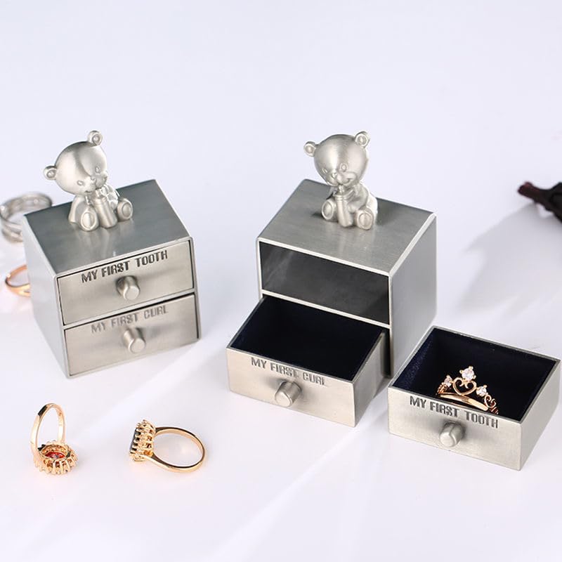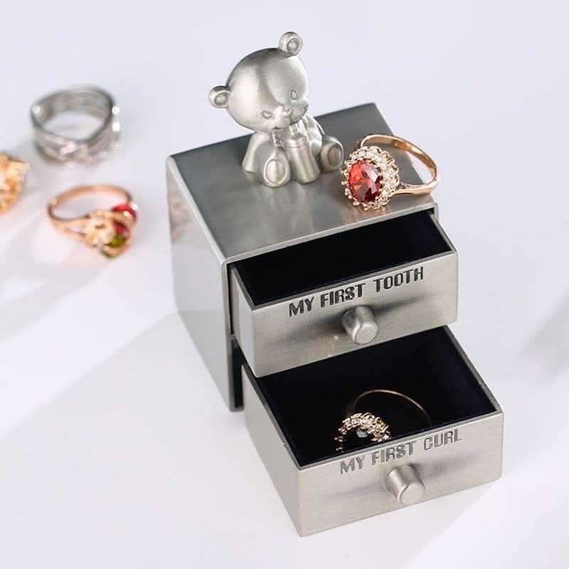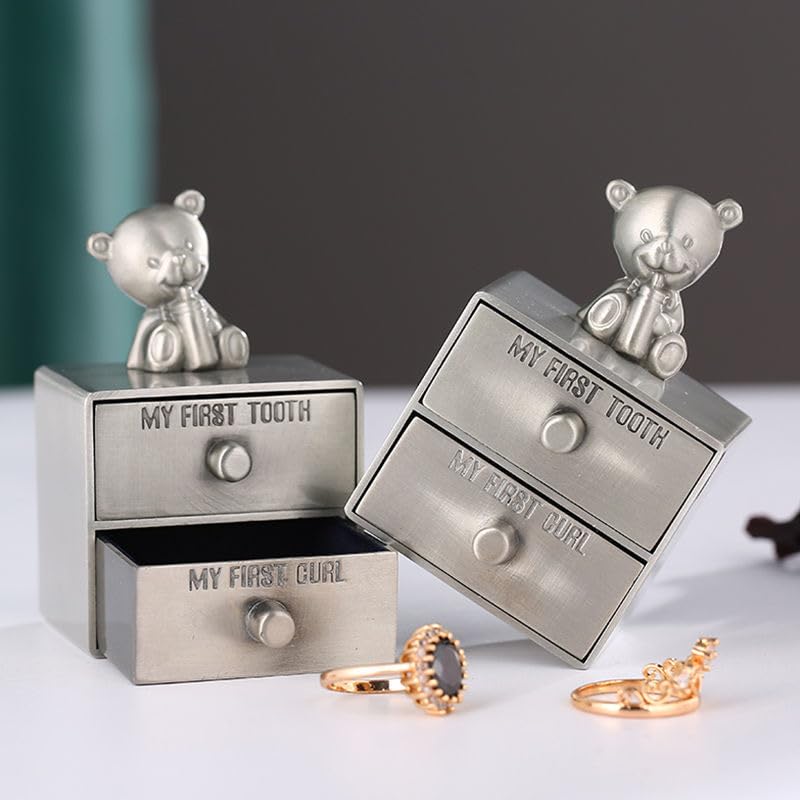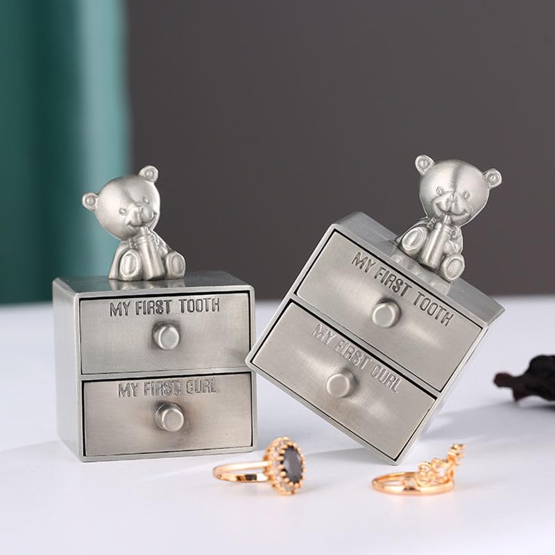 Celebrate your baby’s cherished milestones with this adorable Teddy Bear Keepsake Box, designed to preserve their first tooth and curl forever. Crafted from durable zinc alloy with a charming vintage silver finish, it features two separate drawers clearly labeled “My First Tooth” and “My First Curl,” each lined with soft velvet to keep your memories safe. Topped with a cute smiling teddy bear, this keepsake box not only stores precious items but adds warmth to any nursery or display shelf. Its compact size makes it perfect for gifting – whether it’s for your own little one or a thoughtful present for a new parent. Ideal for baby showers, baptisms, or newborn celebrations, this keepsake box turns small moments into lasting treasures.