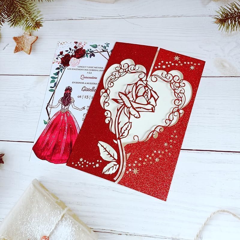 50 sets Glitter Red Laser Cut Quinceanera Invitation Card DIY Sweet 15 Birthday Party Invites with Insert and Envelopes