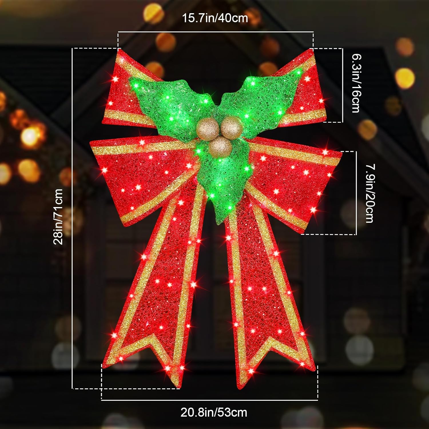 Transform your holiday decor with this stunning 36-inch LED Christmas bow that combines classic festive charm with modern illumination. The bow features a luxurious design with a vibrant red ribbon adorned with elegant gold trim, complemented by lush green holly leaves and golden berries at its center. Pre-lit with twinkling LED lights that create a magical sparkle effect, this bow adds a captivating glow to your seasonal display. At an impressive 36 inches, this statement piece serves as a perfect wreath topper or can be used as a standalone decoration for doors, walls, or large windows. The red and green color combination with gold accents embodies traditional Christmas spirit while the built-in lights eliminate the need for additional lighting arrangements. The bow's generous size and brilliant illumination make it a striking focal point that's visible both day and night, perfect for creating that welcoming holiday atmosphere at your entryway or as part of your indoor Christmas decorations.