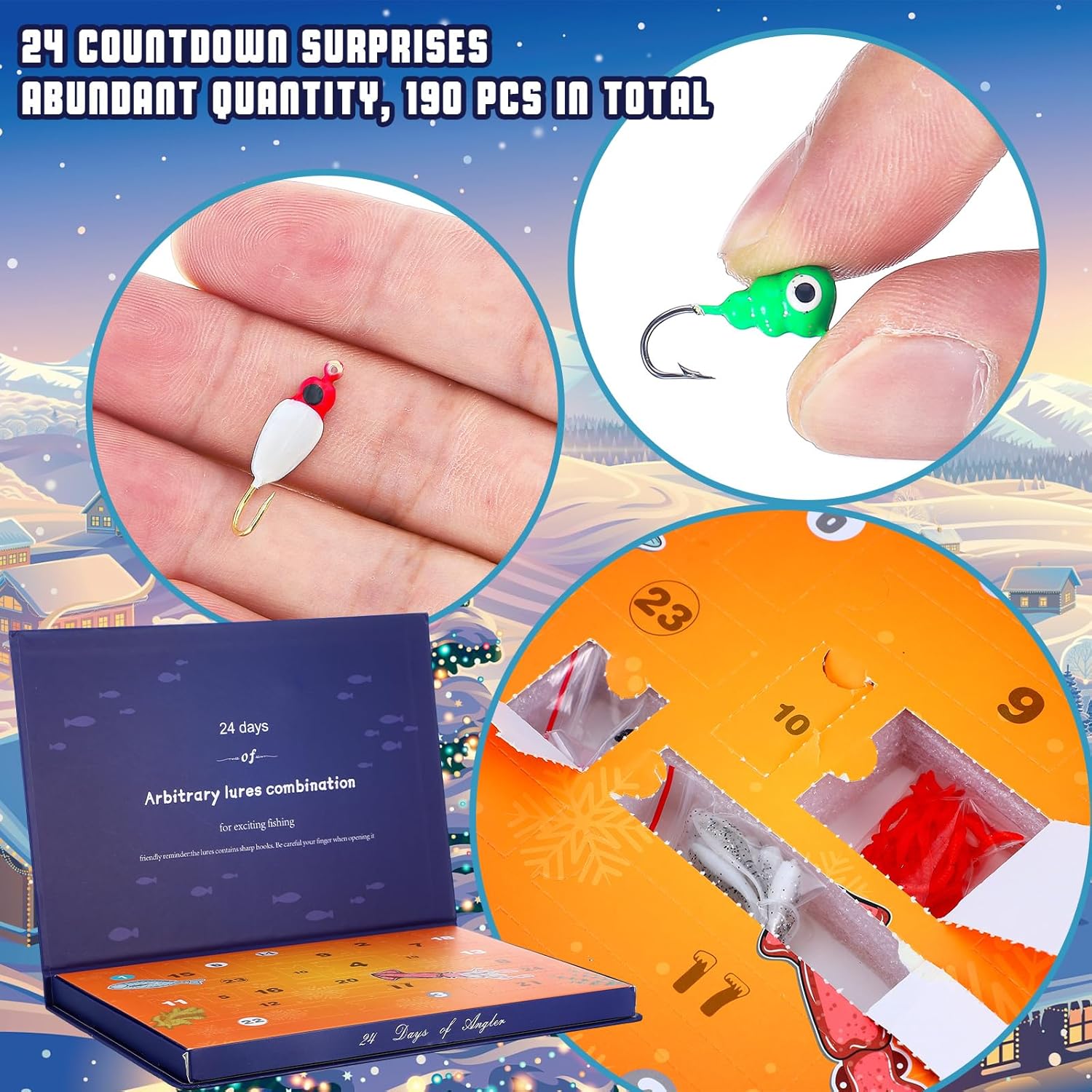 Features: The 24 days Christmas countdown fish tackle set is adorable Christmas supplies because of its attractive designs and elegant hue. You can put them on the table or anywhere else you choose for an enjoyable visual experience. The 24 day Christmas advent calendar can also be applied as a gift for family members, friends, relatives, coworkers, neighbors, and other people you care about, so you can send them to show your love and concern, and to strengthen your relationships. Specifications: Material: reliable material Size of lures: different shapes have different sizes Color: colorful Package includes: 1 x Fishing lure advent calendar 2025 (including 190 pieces of fishing lures) Notes: Manual measurement, please allow slight errors on size. The color may exist a slight difference due to different screen displays. Small and pointed items included, please keep them away from young people