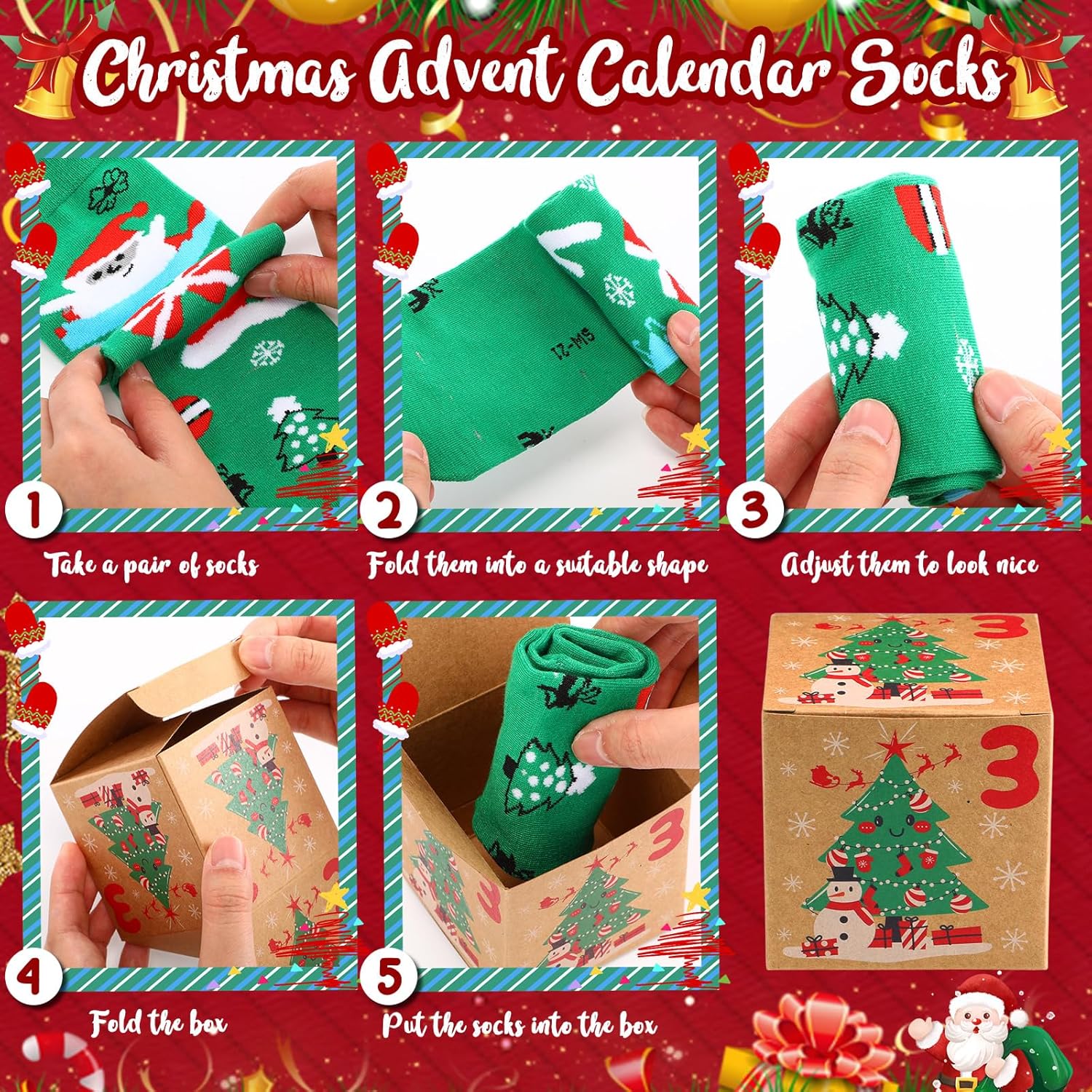 Features: Arriving in a stylish, compact box measuring 2.76 x 2.76 x 2.76 inches (7 x 7 x 7 cm), this Advent Calendar requires no additional wrapping. It's the hassle-free, suitable present for last - minute shoppers, ensuring your gift stands out under the Christmas tree. Each of the 24 pairs features distinct, eye-catching Christmas motifs, from Santas to twinkling snowflakes. They not only keep feet warm but also add a splash of holiday cheer to any outfit, making every step a festive celebration. Specifications: Material: 75% cotton Main Color: red green Size: socks: from US 9-11 box: 2.76 x 2.76 x 2.76 inches (7 x 7 x 7 cm) Package includes: 24 x Socks 24 x Box Notes: Manual measurement, please allow slight errors on size. The color may exist a slight difference due to different screen displays.