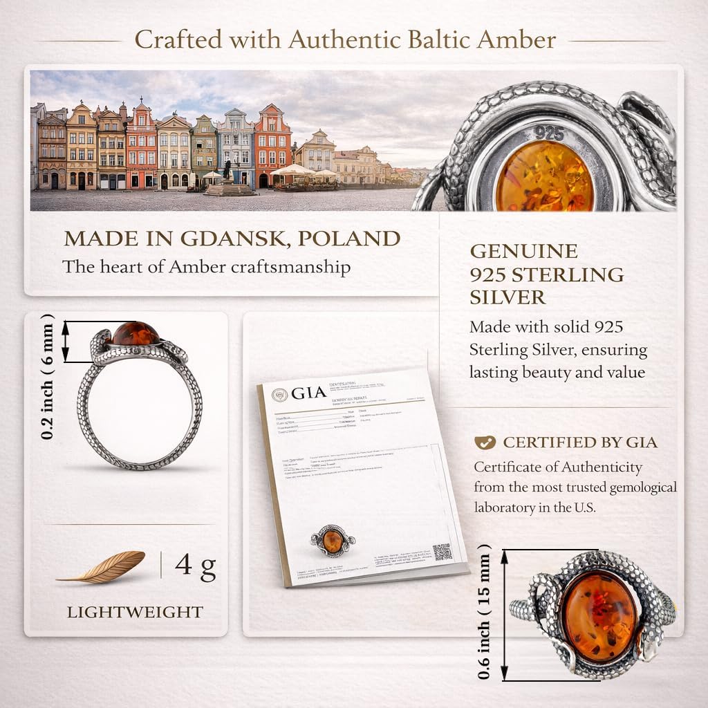 Pieces from our amber collection of rings never fail to impress true admirers of amber jewelry, with their artistic design patterns and magical properties of the amber gem. This uniquely designed sterling silver and Baltic honey amber ring shaped like a snake’s body is no exception. The ring’s structure, in the shape of a snake made with precise and mesmerizing details, holds a beautiful gem of amber in a dark brown color. This, along with the shape of the ring itself, adds a dimension of mystery to the ring, making it not only contain magical properties of amber but also look mythical, fairytale-like and simply surreal. It gives the impression of a hidden, beautiful and forbidden magical object from a fairytale that everyone wishes to find and own. There’s something beautiful and puzzling in the mystery of it, which adds more depth to this stunning piece of jewelry. As snakes are known as representatives of creative life forces, this ring, too, symbolizes rebirth, transformation.If you know someone who’s a creative spirit, this sterling silver and Baltic honey amber snake ring will be a perfect gift choice to make their day. Add another layer of mythical mystery to their daily life and make their jewelry collection more fashionable, dreamy, and mesmerizing.