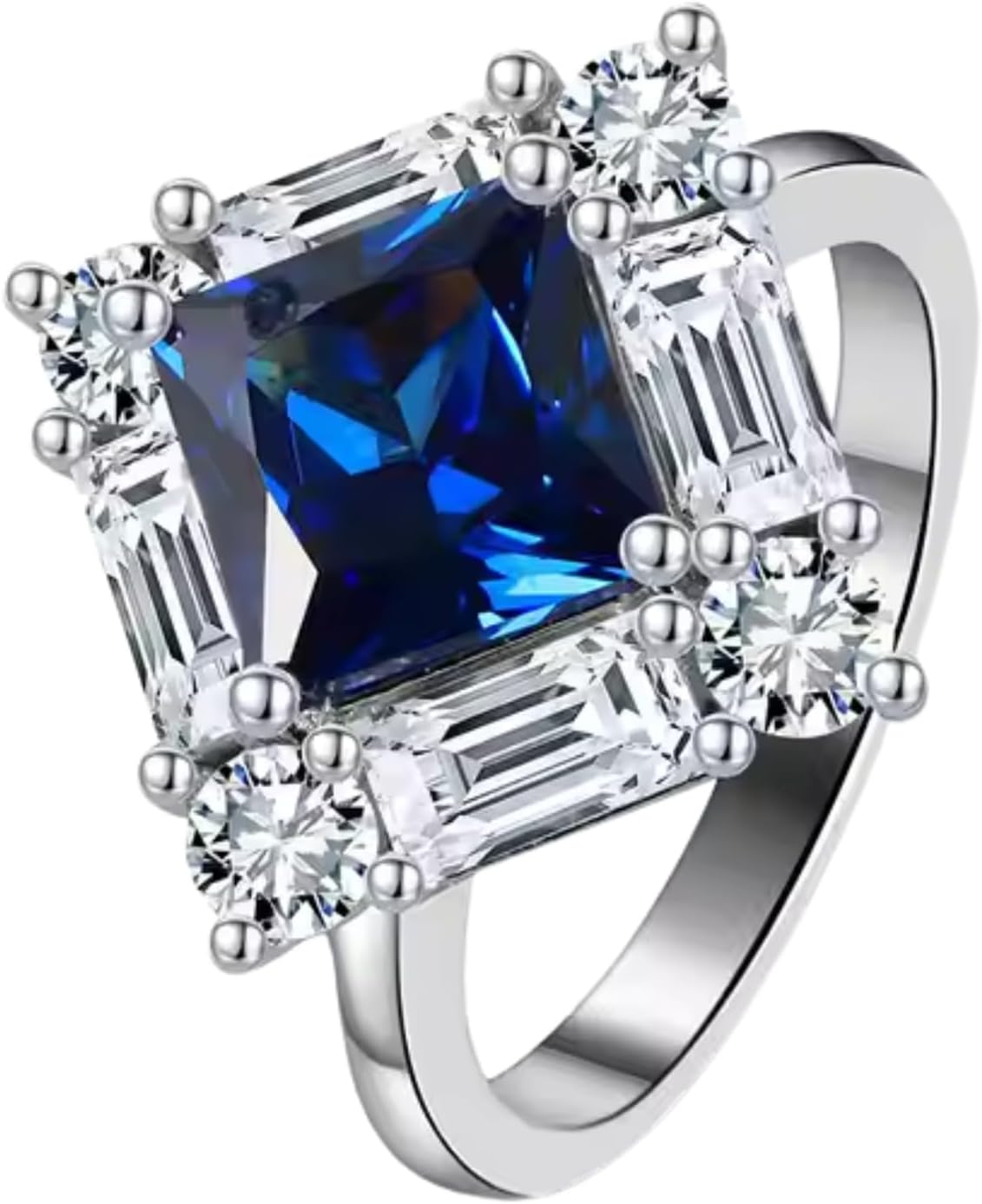 Elevate your special moments with this exquisite Princess Cut Tanzanite ring. Crafted in premium 925 Sterling Silver with luxurious 14k white gold plating, this stunning piece features a dazzling center stone complemented by round and baguette cut simulated diamonds along the sides. The ring's sophisticated design makes it perfect as a promise ring or for that unforgettable proposal. Available in sizes 4 through 13, this versatile piece combines timeless elegance with modern styling. The brilliant tanzanite takes center stage while the carefully placed side stones add extra sparkle and dimension to this remarkable ring. The sterling silver construction ensures both durability and lasting beauty, while the white gold plating provides a premium finish that catches the light beautifully.