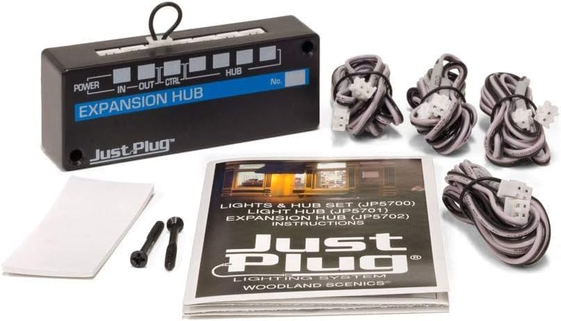 Woodland Scenics Just Plug Lighting System, Light Hub, Expansion Hub, Auxiliary Switch and Power Supply with Make Your Day TweezersIncludes Make Your Day Tweezers, Just Plug Lighting System, Light Hub, Expansion Hub, Auxiliary Switch, and Power Supply All you need is power! This is the quickest and easiest way to add lights to any project. Use the individual dimmer controls to regulate light brightnessUse the Expansion Hub to connect up to four Light Hubs, expanding your Just Plug Lighting System quickly and easily.Use the Auxiliary Switch to turn lights on and off with the flick of a switch. Control the power to a Light Hub, Sequencing Light Hub, Expansion Hub or to multiple Hubs.Just Plug Power Supply powers up to 50 lights on your light systemLights & Hub setAll you need is power! This is the quickest and easiest way to add lights to any project. Use the individual dimmer controls to regulate light brightness. Add an optional Auxiliary Switch for convenient operation. Powering Your Light System- You will need one Just Plug Power Supply (JP5770 US, JP5771 Euro, JP5772 UK or JP5773 Aus/NZ) to power up to 50 lights on your light system, or if you want to power your system from a train power pack, purchase Connecting Cables (JP5760).Expansion HubUse the Expansion Hub to connect up to four Light Hubs, expanding your Just Plug Lighting System quickly and easily. Add an optional Auxiliary Switch for convenient operation.Do NOT plug LED lights into Expansiuon HubAuxiliary SwitchTurn lights on and off with the flick of a switch. Control the power to a Light Hub, Sequencing Light Hub, Expansion Hub or to multiple Hubs. Easily mount switch to main control panel with mounting screws or double-sided tape, if desired.Just Plug Power SupplyThe transformer connects to the Light Hub or Expansion Hub and powers up to 50 Light Hub Ports.