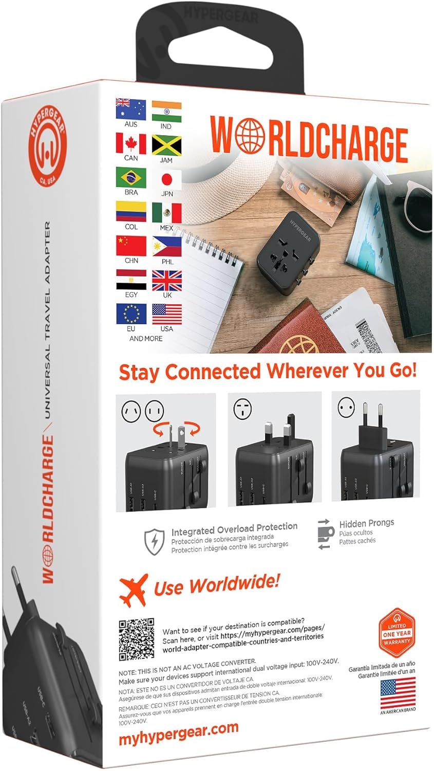 Universal International Travel Power Adapter with USB-C Portable and Compact Converter US, AUS, EU, UK outlets Adapter Type-C Fast Charge Dual USB (Black)