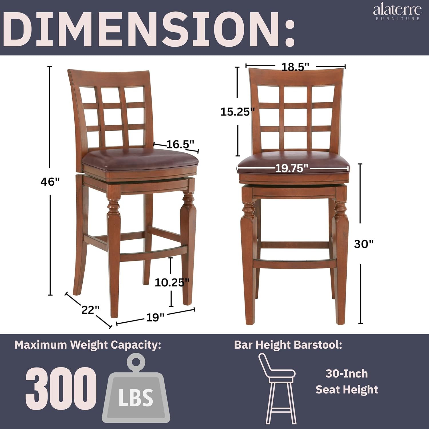 Upgrade your bar or kitchen seating with the Napa Bar Height Swivel Stool with back, a refined blend of classic craftsmanship and modern functionality. Featuring a 30-inch seat height ideal for bar-height counters and pub tables, this stool offers timeless elegance with its turned solid rubberwood legs, lattice back design, and rich mahogany finish. The foam-padded faux leather seat delivers lasting comfort, while the steel memory return swivel allows for smooth rotation that automatically re-centers—perfect for social spaces. A durable metal kick plate protects the footrest from scuffs and wear, and the stool’s 10.25-inch footrest height provides ergonomic support for extended sitting. Built to support up to 300lbs, the Napa stool is as durable as it is stylish. Whether you're styling a kitchen island, basement bar, or entertainment area, this bar-height stool adds warmth, comfort, and a polished finish to any space. Easy assembly required and spot or wipe clean. IMPORTANT: Alaterre Furniture is committed to providing the consumer with the absolute best price and value on our entire line of products. NOTE: This is an exclusive product of Alaterre Furniture and ONLY Bar Height Swivel Stools by Alaterre Furniture are GUARANTEED to be genuine. Avoid buying counterfeit products and transacting with unauthorized sellers.