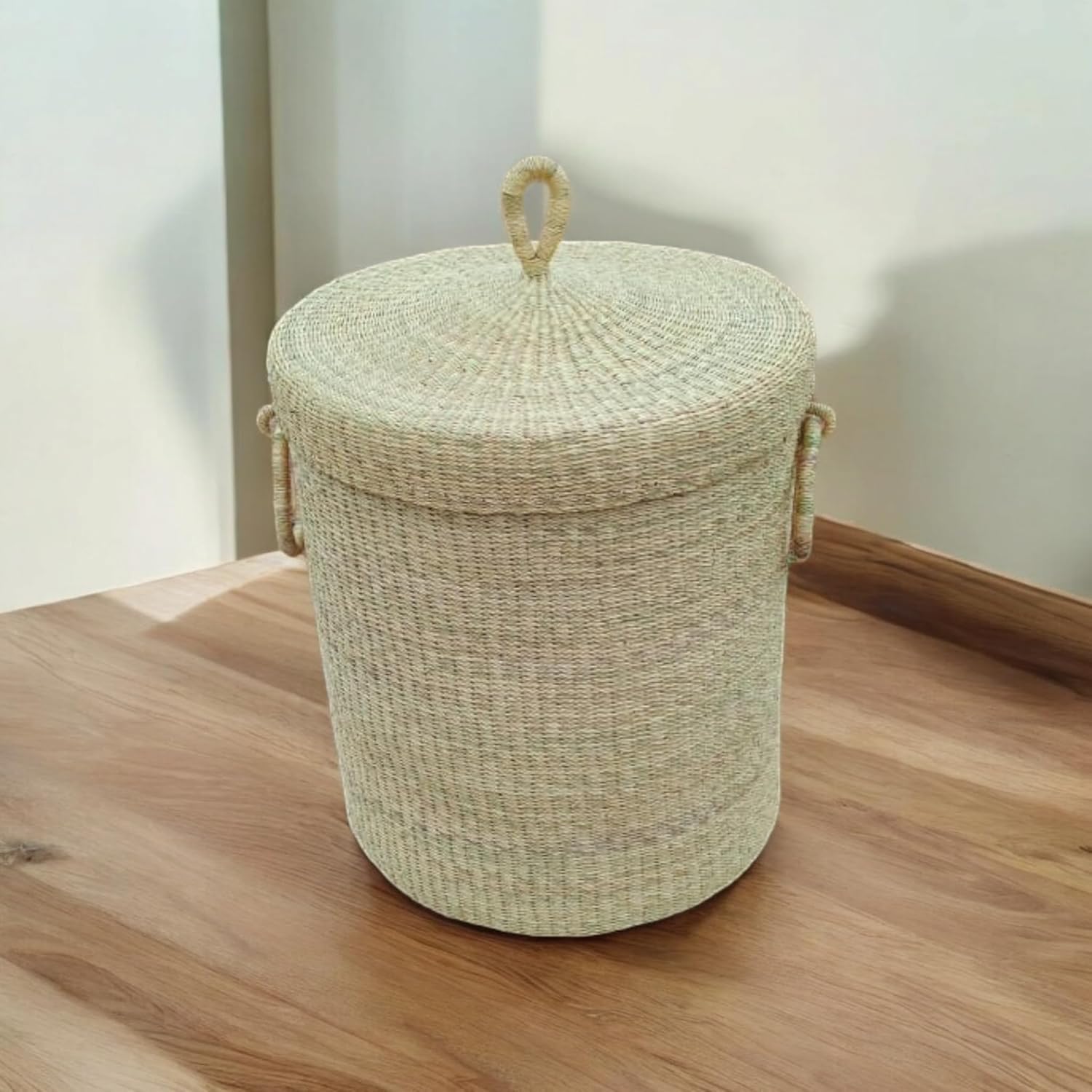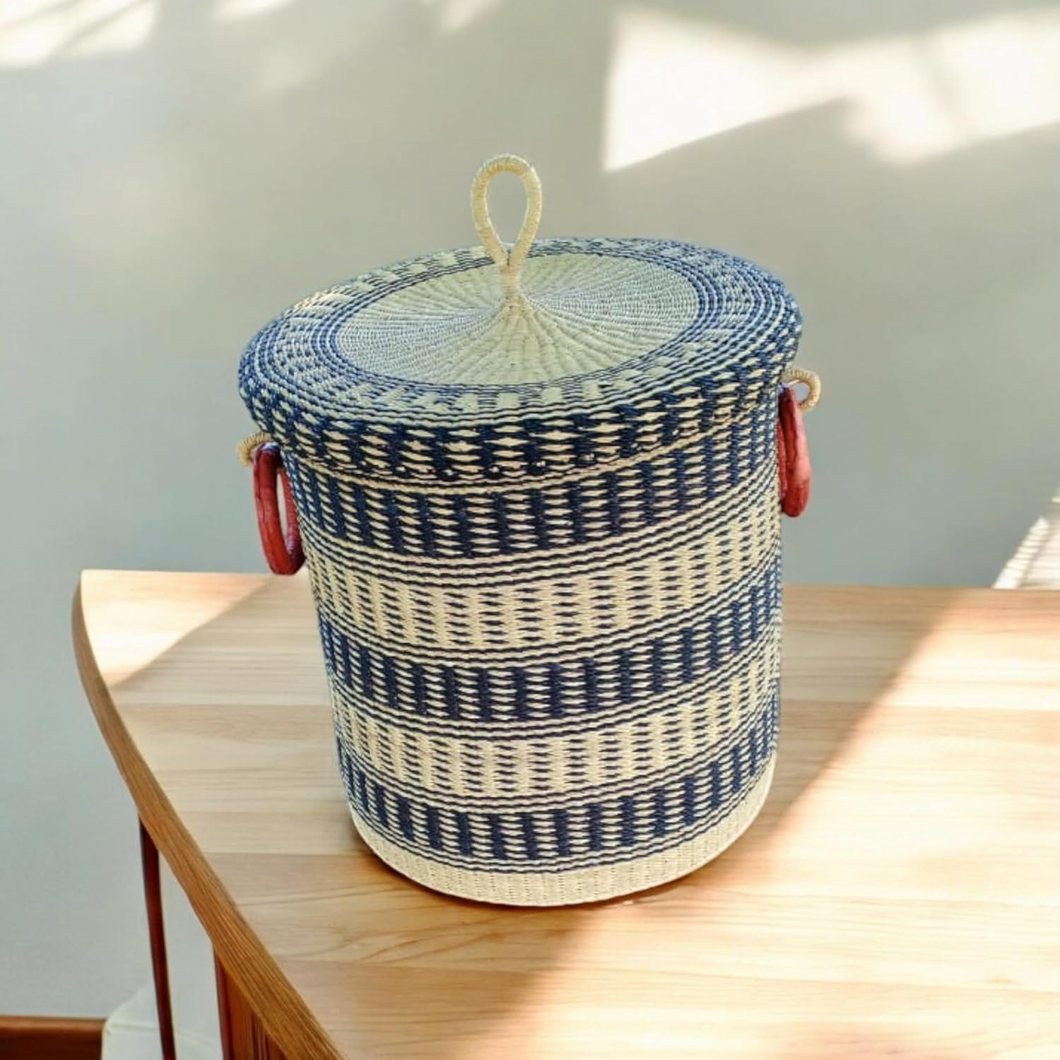 This handmade African straw laundry basket with lid is perfect for organizing and storing items in your home. Expertly handwoven from natural straw and rattan, it is sturdy, eco-friendly, and built to last. The basket features a beautiful black and white pattern that adds a warm, organic touch to any space. With its functional lid and strong handles, this woven basket makes it easy to carry, access, and hide clutter. Its natural straw texture provides a rustic yet elegant look, making it a great fit for modern, boho, or traditional décor. Whether used in your living room, bedroom, laundry room, or entryway, this African handmade basket helps keep your home neat and stylish. Each piece is ethically crafted in Ghana, reflecting authentic artistry and cultural heritage. Bring beauty, organization, and sustainability into your home with this versatile woven straw storage basket — a timeless and functional addition to any room.