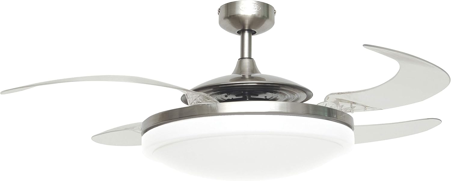 Fanaway EVO2 48" Retractable Blade Ceiling Fan with Light and Remote, Modern Fandelier Ceiling Fan, White combines modern style with dependable everyday airflow and integrated illumination. The AC motor delivers 3-speed performance with a reversible motor (summer/winter mode) for year-round comfort. Retractable blades extend when the fan is on and fold away when off for a cleaner chandelier-inspired look. An integrated dimmable LED light makes it easy to fine-tune brightness for everyday tasks or evening ambiance. Fanaway patented design and technology deliver the brand’s distinctive retractable-blade fandelier look. Stronger, thicker blades are up to 3× heavier than typical blades for greater durability and more stable airflow. Durable PC blades provide long-lasting performance and help promote stable airflow. Dry location rated for indoor use. ETL/cETL safety certification supports reliable installation and everyday use. A remote control is included for convenient operation from anywhere in the room.