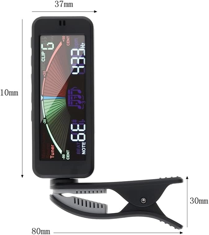 3 In 1 Guitar Tuner Large LCD Screen Metronome Generator With Clip For Chromatic Guitar Bass Ukulele Violin 3 in 1 design: tuner, metronome and tone generator.The largest and unique colorful LCD display ensures easy viewing under any condition.Equipped with 360 degree rotary clip, it can be adjusted to perfect viewing angle.The clip opening is anti-slip, and able to clip onto the instrument stably.Sensitive and accurate tuning for chromatic, guitar, bass, ukulele and violin.Battery: 2 x AAA Batteries(not included)Tuning Range(HZ): A0(27.50Hz) - C8(4186.00Hz)Product Dimensions (L x W x H): 100x60x36MM/3.94x2.36x1.42Inchescolour: blackMaterial: plasticPackage includes:1 x Guitar TunerOnly the above package content, other products are not included.Note: Light shooting and different displays may cause the color of the item in the picture a little different from the real thing. The measurement allowed error is +/- 1-3cm.Item specifics:Material: PlasticOrigin: Mainland ChinaRecommend age: 12+y