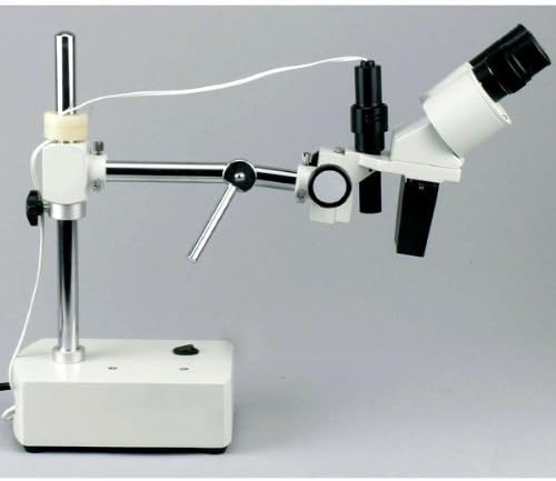 The AmScope SE401Z-5M digital professional stereo microscope has interchangeable pairs of 10x and 20x widefield eyepieces, a 1x objective, LED lighting, and a boom-arm stand. The 5MP camera has a CMOS color sensor, a reduction lens, image capture and editing software, and USB 2.0 output to capture or display still or video images on a computer or projector. The binocular viewing head has an interpupillary range of 50 to 77mm and a 45-degree inclination to reduce eye and neck strain. The interchangeable pairs of WF10x18mm and WF20x10mm eyepieces combine with the 1x objective to provide 10x and 20x magnification, and a longer working distance for inspecting large-scale specimens that require handling or repair. Dioptric adjustment accommodates individual eye-strength differences. A digital stereo microscope, sometimes called an inspection or dissection microscope, has low magnification and a long working distance that enables users to manipulate the object being inspected, and is used where image capture, detailed records, or documentation is required. The 5MP digital camera has a CMOS color sensor for displaying still microscopy images and streaming live videos to a computer or projector. The camera has 40x magnification and a 0.5x reduction lens that ensures that the display has a similar field of view as the microscope eyepiece. The camera can be mounted in a C-Mount or any 23mm eye tube. The camera includes image capture and editing software that provides still image and live video capture and editing capability, including measurement functions. The software supports JPG, TIF, GIF, PSD, WMF, and BMP file formats and is compatible with Windows XP, Vista, 7, and 8; Mac OS X; and Linux. Camera drivers are compatible with Windows XP, Vista, 7, and 8; Mac OS X; and Linux. The software includes Windows APIs for native C/C++, C#, DirectShow, Twain, and LabVIEW that enable custom application development. The camera has a USB 2.0 data port (cable included).The 1W LED light is mounted on a flexible gooseneck to enable users to direct the light as needed. An LED light source provides bright, cool light for working with temperature-sensitive specimens. The microscope has a 13.5" pillar that provides a 9" vertical working distance. Bilateral focus eases use for left- and right-handed users. The 17" boom arm has a 12" working distance. The microscope head can be rotated on the X- and Y-axes. All metal construction is durable and stain-resistant. Microscope SpecificationsHeadBinocularMagnification10x, 20xObjective power1xEyepieces (DIN, 30.5mm)WF10x18mm, WF20x10mmFocusBilateral coarseMicroscope standBoom-arm standVertical working distance9" (13.5" overall pillar length)Boom arm12" working distance (17" overall length)Head rotationX- and Y-axesIllumination typeUpper, reflectedLight source1W LED on adjustable gooseneckPower110V-120V, UL listedCamera SpecificationsResolution5MP (2592 x 1944 effective pixels)Image typeStill image and video display and captureCamera typeBrightfieldCamera sensor1/2.5" Aptina MT9P001 CMOS (color)Magnification40xReduction lens0.5xMounting size23mm or C-MountFrame rate60 fps at 640 x 480; 18 fps at 1280 x 960; 5 fps at 2592 x 1944Computer connectionUSB 2.0 (backward compatible on PCs only)File formatsJPG, TIF, GIF, PSD, WMF, BMPSoftware packageImage capture and editing for Windows XP, Vista, 7, and 8; Mac OS X; and LinuxCamera driver compatibilityWindows XP, Vista, 7, and 8; Mac OS X; and LinuxMicroscopes are instruments used to enhance the resolution of an object or image. Types include compound, stereo, or digital. Compound microscopes use a compound optical system with an objective lens and an eyepiece. Stereo microscopes show object depth in a three-dimensional image. Digital microscopes are used to display an image on a monitor, rather than looking through a lens. Microscopes can have monocular (one), binocular (two), or trinocular (three) eyepieces, with varying magnification abilities. Magnification ability refers to the size of an image. Resolution, also known as resolvant power, refers to the clarity of the image. The interaction between field of view (FOV), numerical aperture (NA), and working distance (WD) determines resolution. Microscopes can control magnification through a fixed focus, or through a range of adjustments. They can also utilize LED, fluorescent, and mirror light sources to help control viewing capabilities. Microscopes are widely used in education, lab research, biology, metallurgy, engineering, chemistry, manufacturing, and in the medical, forensic science, and veterinary industries.United Scope manufactures microscopy equipment and accessories under the brand name AmScope. The company, founded in 1996, is headquartered in Irvine, CA.What's in the Box?AmScope SE401Z-5M stereo microscope with boom-arm standWF10x18mm eyepieces, 30.5mm, one pairWF20x10mm eyepieces, 30.5mm, one pair1x objective5MP digital camera (MU500)0.5x reduction lensUSB 2.0 cableSoftware CD(2) Eye guardsLED lightDust coverPower cordInstructions