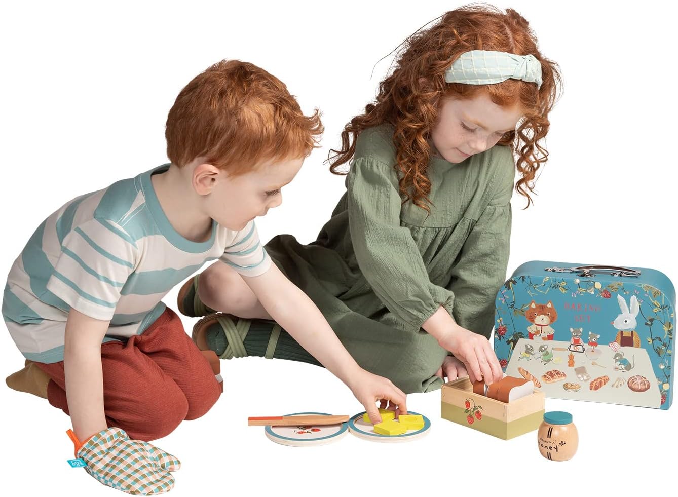 The Forest Tales toy baking set with carrying case is uniquely designed to take the imaginary warm bread, butter and honey when and wherever the fun is going to happen. The 17-piece wood play kitchen accessory set includes a wooden loaf pan with decorative strawberry prints, toy oven hot mitt, 5 thick-sliced solid wood pieces of bread, 4 pats of wooden butter, wooden knife, 2 color-coordinated wooden plates and a jar of organic honey with lid. The bread and butter slices are attached to each other with hook and loop fabric, allowing kids to pretend slice them with the toy butter knife. This collection makes an ideal toddler birthday gift to complement any toy tea party set for dolls or stuffed animals. The pretend baking set encourages imaginative role-play, social skill engagement, cause and effect learning and motor skill development. Since 1978, Manhattan Toy has been making award-winning, high quality, educational toys for your baby, toddler or kid. From baby toys and toddler toys to wooden toys and activity centers, our goal is to provide the safest and best toys available. All of our products, from the newest concepts to our time-tested classics, are innovatively designed to inspire imaginative play.