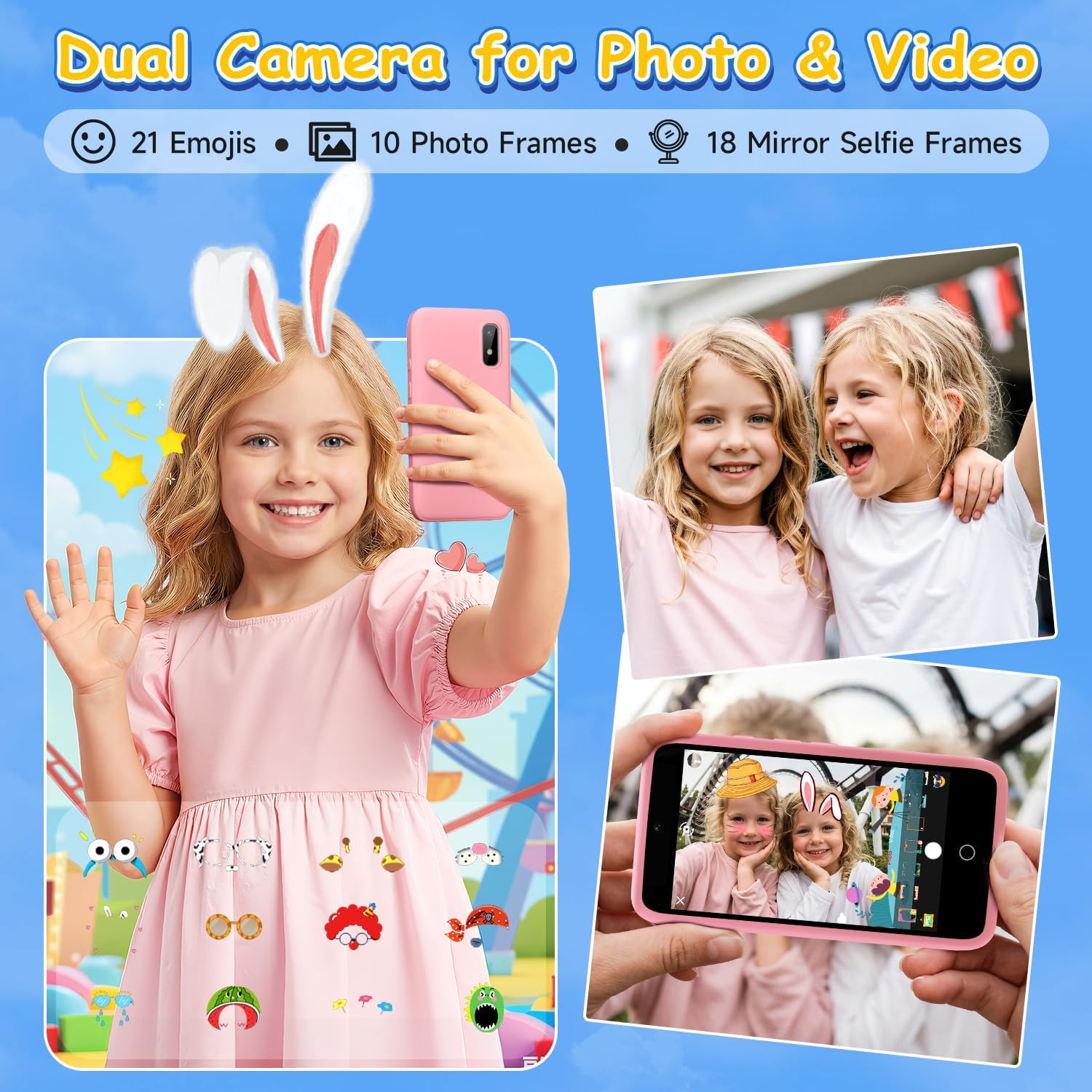 • 【Dual Camera Toddler Phone】: This toy smartphone supports dual camera photography and video recording, just like a real phone. With cute stickers and frames, kids can take funny selfies, capturing beautiful moments with family or friends. It’s an ideal kids phone for boys and girls who love to explore and create.