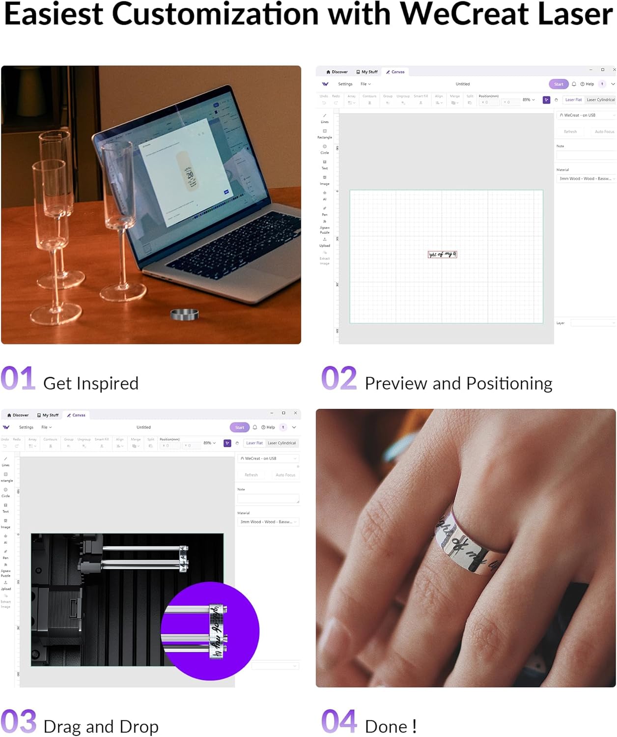 • Ultra-Precision 0.03mm Laser Spot: WeCreat 1064nm laser module is more suitable for processing finely detailed small objects. Paired with WeCreat Vision’s HD camera and auto-lifting features for jewelry personalization perfected.