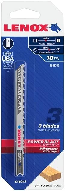 LENOX Tools 1990963 U-Shank clean wood cutting jig saw blade, 4-inch x 5/16-inch 10 TPI, 5-Pack provides users with improved blade durability and clean, smooth cuts in wood. Power Blast technology® strengthens the blade to reduce breaks and increase durability. Precision ground teeth with optimized tooth angles provide a clean finish. Bi-metal technology flexes to resist breaking and extend blade life.