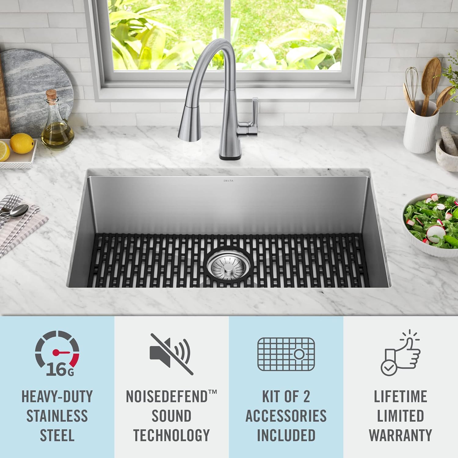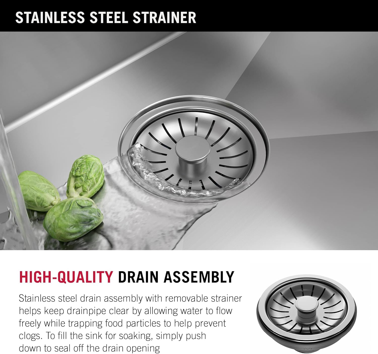 | Included Components | Sink, black silicone bottom grid, stainless steel drain assembly w/ strainer |