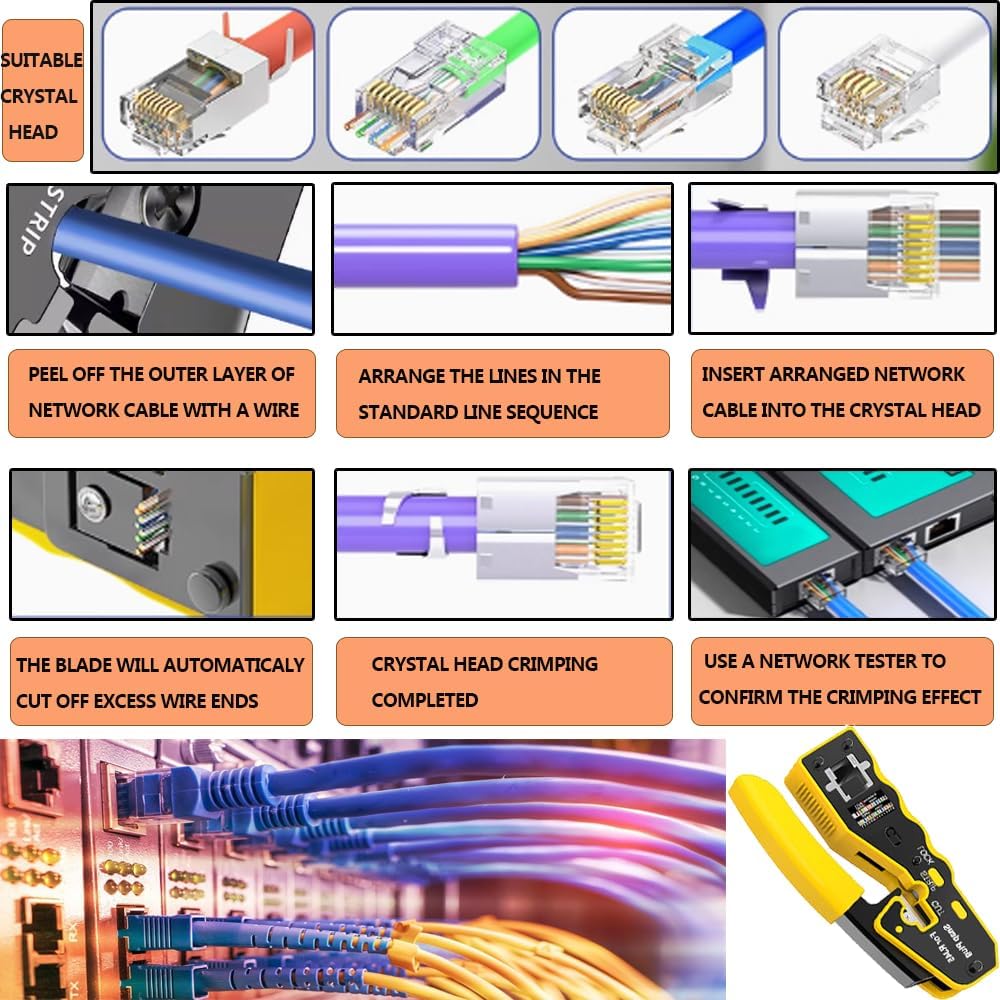 Company: LEATBUY-TECH is a company specialized in producing Tools for 12 years. Smart design and intelligent element are always created by our designers.All tools are bulit with Smooth & Sharp Cutter, and good for work. Function Features: 1. High leverage and stability for your wiring connections Whether you need to upgrade your network or make fast repairs that will last, RJ45 Crimping Tool by LEATBUY-TECH is your must-have wire terminal tool. 2. It cuts, strips and terminates RJ11/12 and RJ45 extended copper wires with a precision die head that provides 360 degrees of connector support during the crimping cycle. 3. Textured handles provide a non-slip grip for enhanced control and comfort. 4. Long-lasting durability and easy use 5. Our Crimping Tool is made of professional-grade heavy-duty steel so it delivers exceptional torque without bending. 6. Expanded surface area on contact drivers delivers full uniform crimp force for fast, accurate crimping. 7. Black oxide finish resists rust and corrosion, making our wire terminal crimper an outstanding addition to your electronics tools. Packing included: 1 x High End Network Cable Tester (Battery not included, for testing telephone or network cables) 1 x Network Crimper 1 x Yellow mini Stripping plier 1 x Stripping crimper 1 x Punch-down tool 50 x Crystal RJ45 network cable connectors 50 x RJ45 network cable connectors 1x Zippered Carry Bag 100 pcs Cable Ties 1 pc Cable Direct