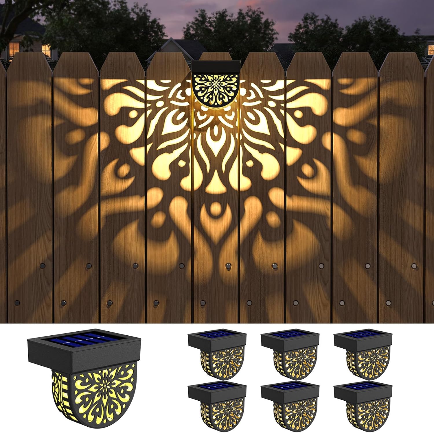 Dimensions:Black, 6 Pack, Mandala Moon Pattern.Instructions:1. You need to turn on the ON/OFF switch on the solar panel, keep the switch in the ON position.2. You need to charge the solar fence lights in the sun for 5-8 hours.3. You need to use screws to fix these outdoor solar lights on the wall, fence or other places.4. You can see the fence solar lights light up in the evening or at night.5. In winter, remove the snow or the dust from the solar panel so that it can be better charged. The working hours normally reduce at winter due to the soft/weak sunlight.The reason why the fence solar light is not on:1. The ON/OFF switch is not turned on.2. The solar powered outdoor lights are not being charged.3. The solar deck lights are placed under strong light or sunlight.4. If none of the above conditions, the solar fence lights may be broken, please let us know.Notice:1. Dimensions are manually measured. There may be a little errors.2. The picture may be slightly different from the actual product.3. Each product has passed quality inspection before leaving the factory, but we cannot guarantee that the product will not be damaged during transportation. If there is a problem with your product, please feel free to let us know within the 180 days warranty period.