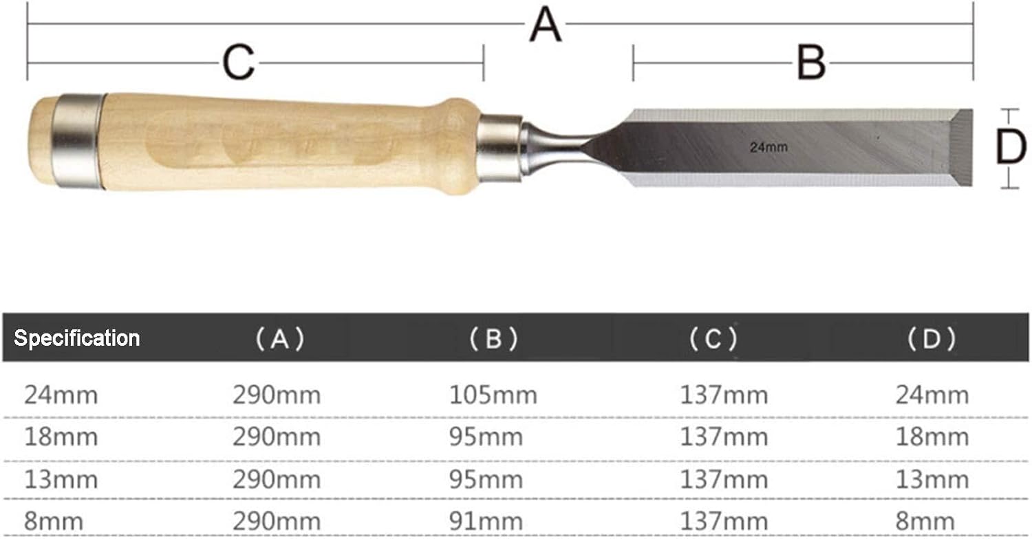 Elevate your woodworking projects with this 4-piece Wood Chisel Set, meticulously designed for precision, durability, and comfort. Whether you're a professional woodworker or a DIY enthusiast, this set offers everything you need to handle challenging tasks. The set includes four essential chisel sizes: 8mm, 13mm, 18mm, and 24mm, allowing you to tackle a variety of carving, trimming, and mortising tasks with ease.Crafted chrome vanadium steel (CRV100), these chisels maintain a sharp edge longer than standard tools, ensuring reliable performance over time. The chisels are bevel-ground at a 25-degree angle, providing a perfect cutting edge that can be used straight out of the box.The ergonomically designed ashtree wooden handles ensure a secure, comfortable grip, even during extended carving sessions, while the moderate weight distribution helps reduce hand strain. Plus, each chisel is equipped with its own safety cap to protect the blade when not in use.This set is perfect for wood carving, carpentry, and DIY projects, and also makes an excellent gift for any woodworking enthusiast or professional. Whether you're shaping rough surfaces, cutting intricate details, or scraping off excess glue, these chisels are the tools you can rely on for , long-lasting results.