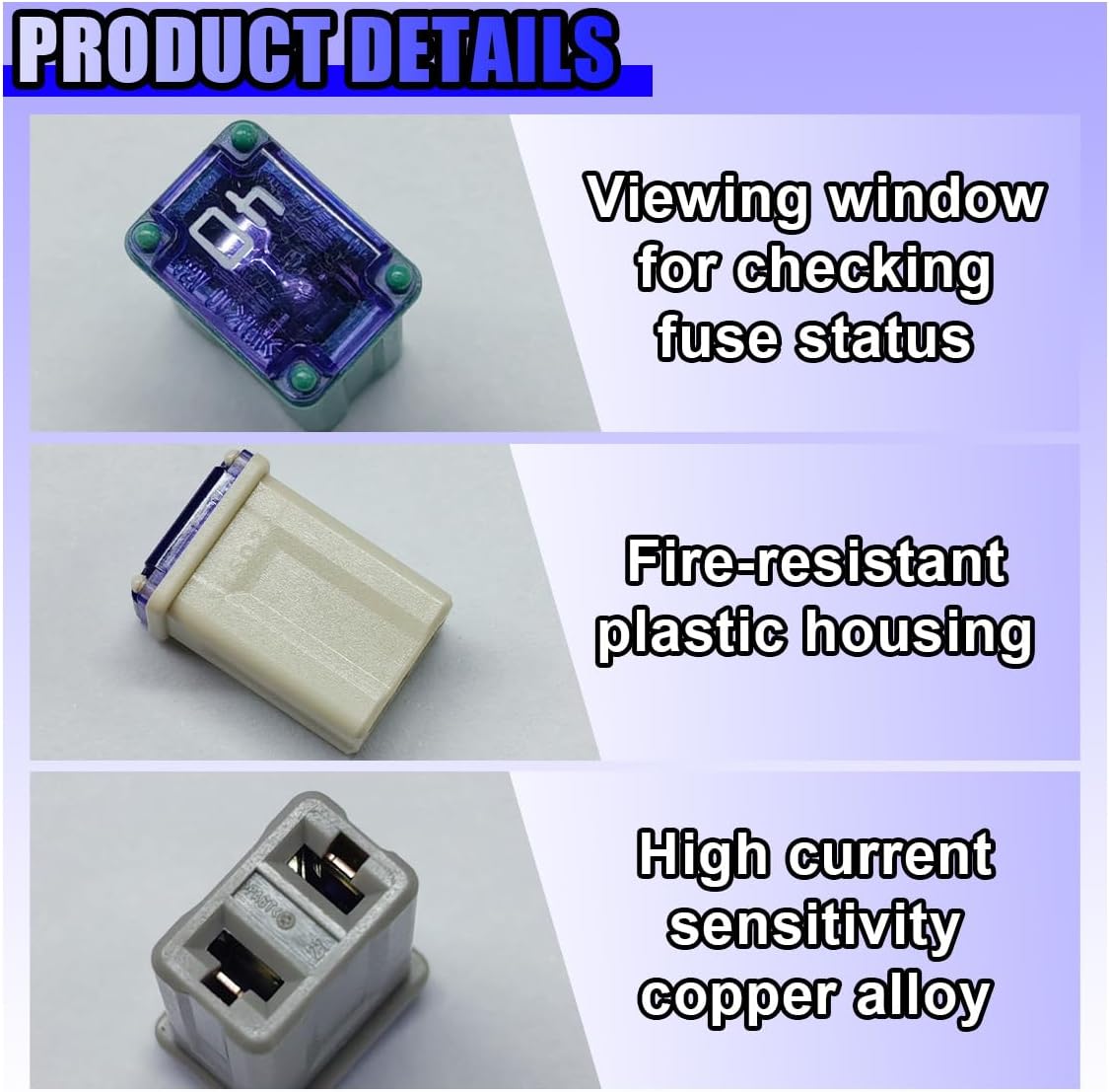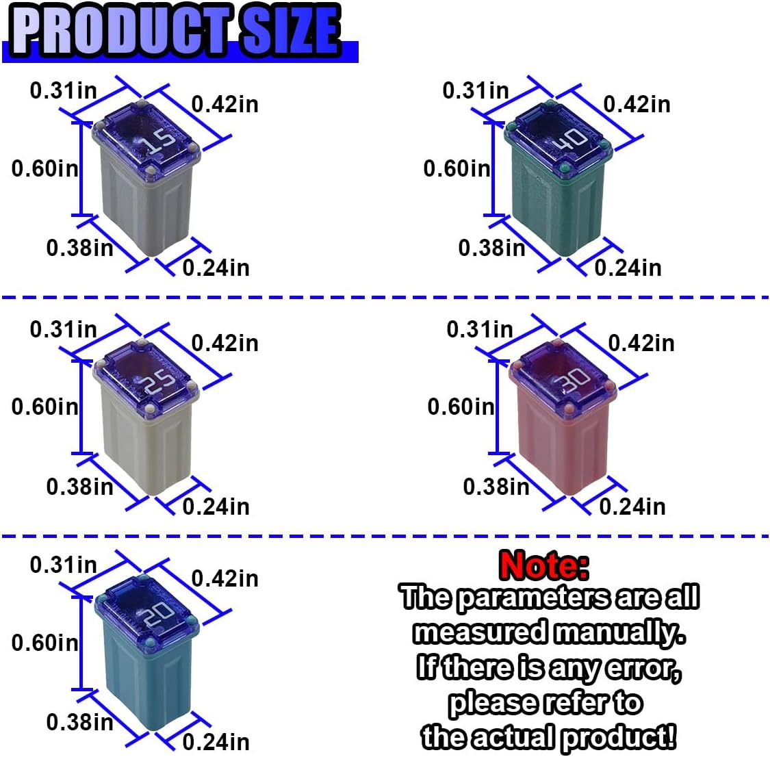 The square plug-in fuse is made of copper alloy and plastic and is rugged. It can withstand extreme temperatures and provide long-lasting protection for your vehicle.SPECIFICATION:Brand: TuxihappName: Micro Cartridge FusesColor: Gray&Blue&Yellow&Pink&GreenMaterial: Copper Alloy+PlasticSIZE:Car Fuse Top: 0.42 × 0.31 inchCar Fuse Height: 0.6 inchCar Fuse Bottom: 0.38 × 0.24 inchApplicable: Most vehiclesFEATURES:-The fuse assortment kit is designed in different colors to facilitate the distinction of fuses with different currents.-The car fuse is compact and portable, and can be stored in the car toolbox for easy access.-The fuse assortment kit features excellent circuit protection and is a safe and reliable automotive accessory.