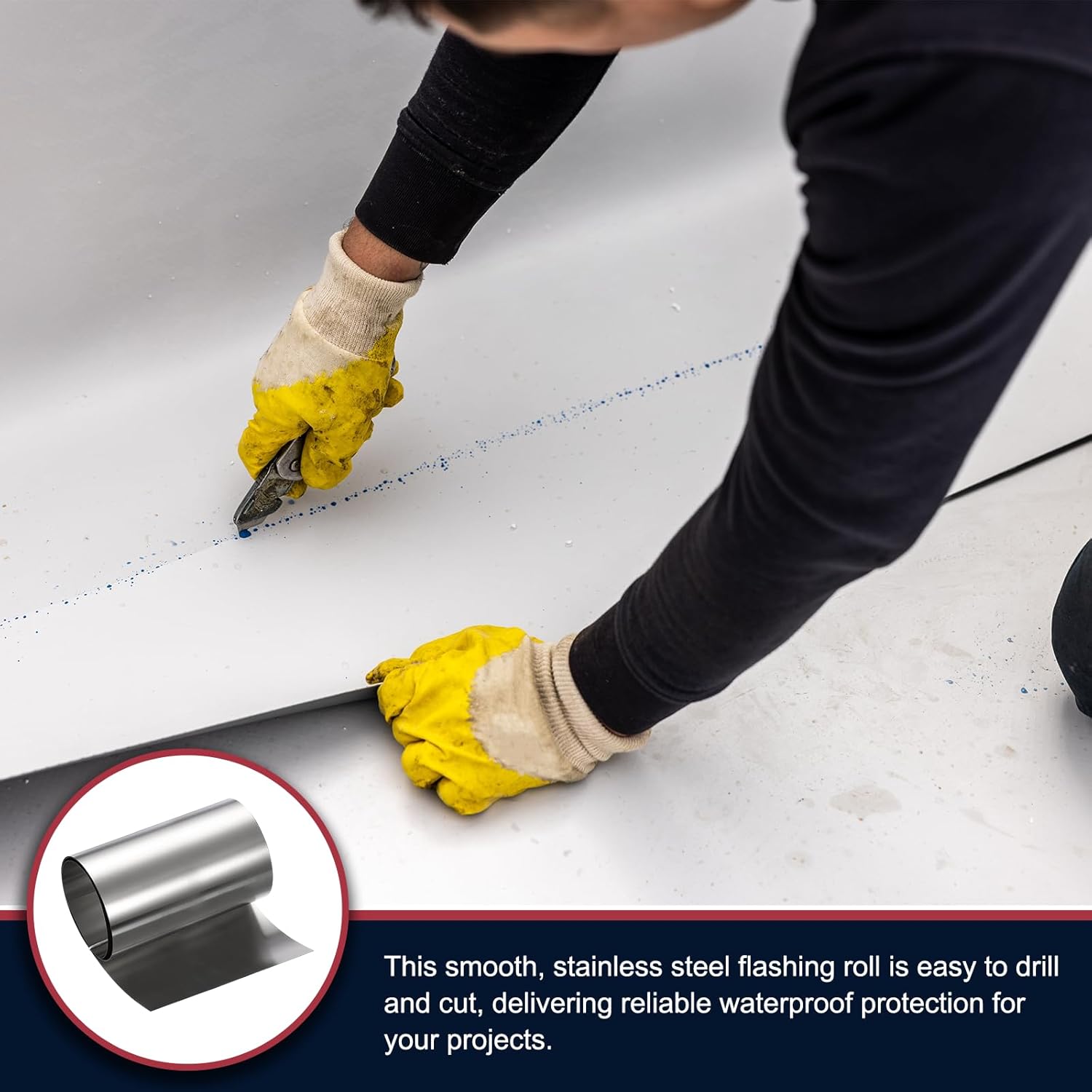 Description:Material - This roof flashing is made of stainless steel, featuring superior durability, corrosion, rust and oxidation resistance. It effectively withstands harsh rain, snow, and extreme temperature fluctuations, while maintaining structural integrity under pressure, stress, or deformation - ensuring long-lasting, reliable protection.Feature - The metal roof panel effectively blocks water penetration at joints, forming a reliable waterproof barrier between building components. Its flexible yet sturdy construction bends and folds easily to fit curved or angled surfaces, making it suitable for custom DIY applications and professional installations alike.Easy to Use - Lightweight and easy to handle, this pliable stainless steel flashing can be easily cut to size and secured to surfaces using nails, screws, or tapes (not included), depending on the application. Please wear the gloves included in the package when handling it. The smooth, clean-finish surface not only performs well but also adds a polished look to both functional and decorative projects.Wide Application - This stainless steel flashing roll is suitable for sealing and protecting various surfaces. It is not only applicable to roofs, chimneys, and pipes but also can be used for car repairs, metal craft production, and easily handles various household decoration, maintenance, and DIY projects in kitchens, living rooms, wall panels, gardening, ceilings, etc.Specification:Color: Silver Material: Stainless Steel Size: 1 m x 300 mm / 3.3 ft x 11.8 inch (L x W)Thickness: 0.2 mm / 0.008 inchPackage Content: 1 Pc x Stainless Steel Flashing Roll with a pair of Nitrile Gloves