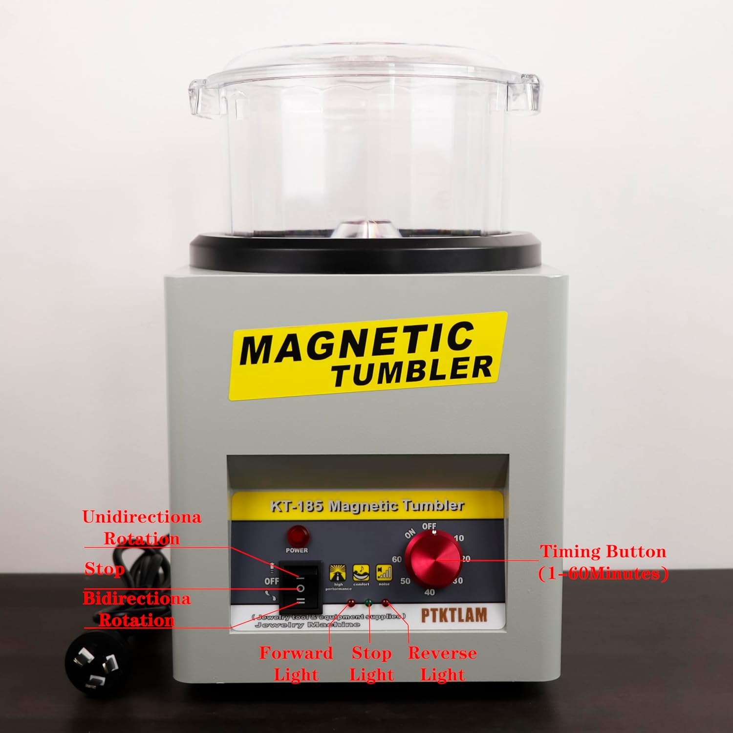 1.The jewelry tumbler polisher is made of tough polycarbonate, with high hardness and no leakage. Roller Size: 7.09 x 3.94 in / 180 x 100 mm, Polishing weight is 300 grams2.The full-featured clear buttons display on the panel allows you to set the time and rotation mode of the magnetic tumbler jewelry polisher with ease. It can reach a multi-angle full grind of the workpiece, quickly removing rust.3.The magnetic tumbler polisher has multiple heat dissipation vents and strong fan cooling to avoid the machine from overheating. What’s more, the portable handles on both sides allow you to easily carry the machine.4.End of the reminder, can remind the completion of polishing, One person can operate more than one5.Polishing process without human intervention6.Magnetic polishing is No dead ends, allowing all parts of the complete grinding; grinding after the workpiece will not be deformed, will not damage the surface, will not affect the accuracy.7.Low cost, Fast Speed , about 2-30 minutes to complete; simple to operate, convenient, operated can be without technology support, One person can use more