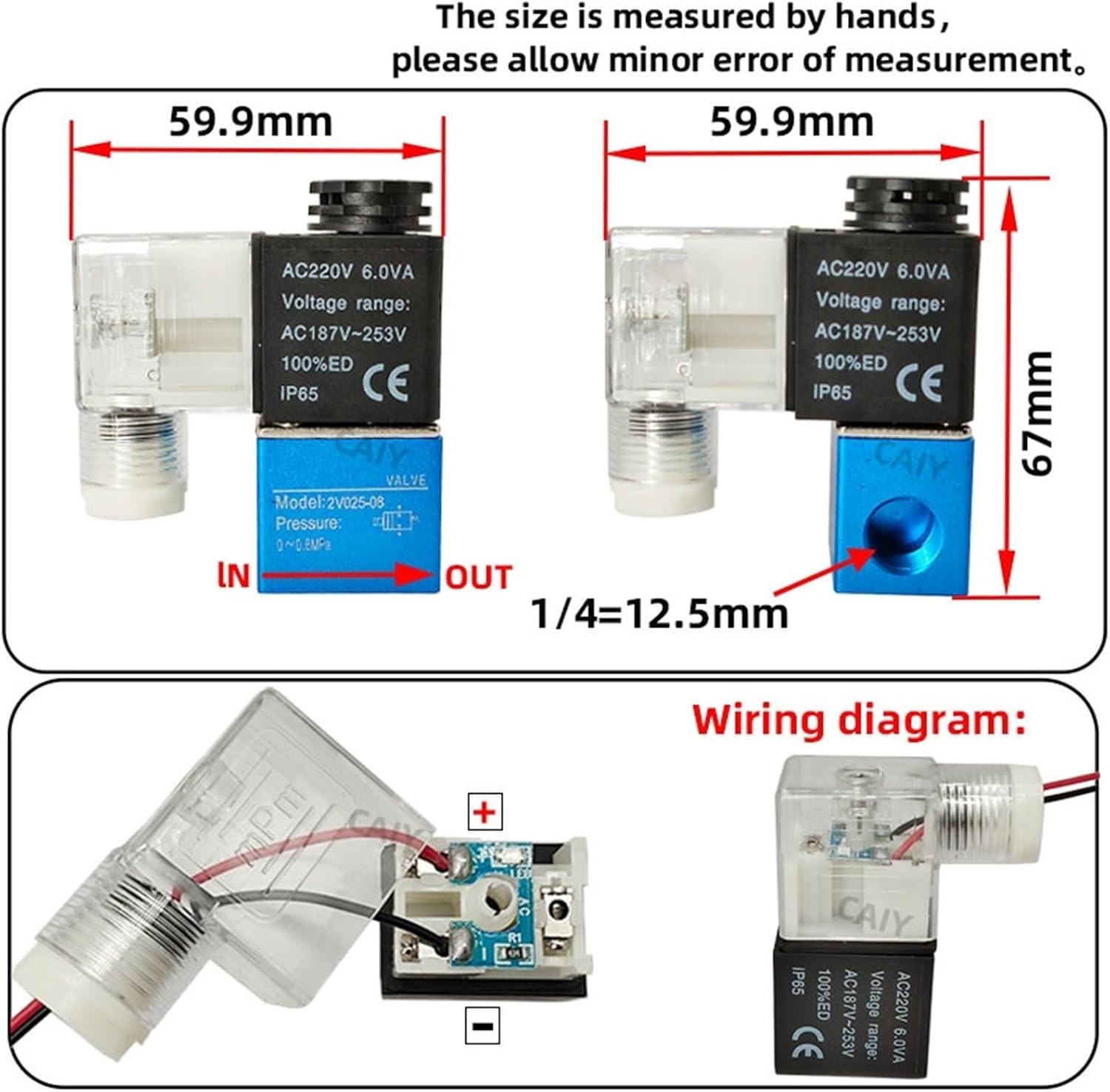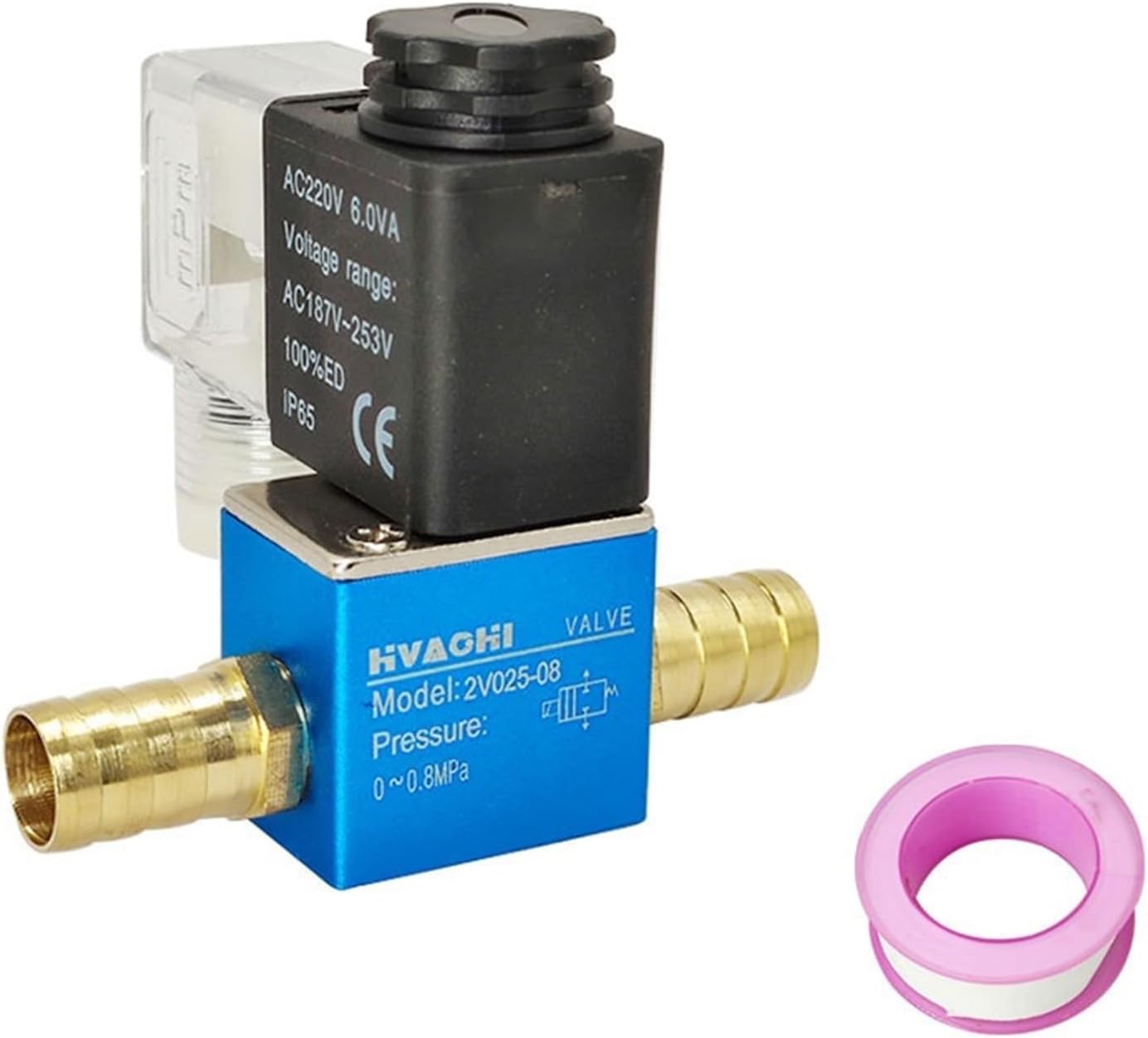ValvesControl ValvesSpecifications:Model Number: 2V025-1/4Valve Type: 2 Way Normally Closed (Valve opens with energized)Port Size: 1/4" Female PortCoil Voltage: DC12V/DC24V/AC110V/AC220V AC380V AC36VMaterial:Body Material: AluminumSeal Material: NBR (Buna N)Armature Tube Material: BrassPlunger & Spring Material Stainless SteelPackage included1 PCS Solenoid Valve2 PCS :Pipe Fitting1pcs :Teflon