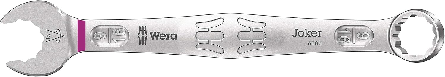 As the installation space becomes increasingly tight during screw driving, it remains necessary that tools enable users to work successfully. Narrow spaces require additional placement points of the tool, to allow screws to be accessed and actuated. Can spanners be modified so that the placement possibilities of the tool increase? The combination of the 7.5° pivoted mouth and the double hexagon geometry doubles the placement points. A repeated 180° turn of the wrench around the longitudinal axis during screw driving provides four placement possibilities, and bolts or screw heads can be "taken" every 15°. The Joker 6003 with its smart mouth geometry significantly expands the range of uses in confined spaces. The Joker 6003 will automatically find the respective placement point after every turn. The slim yet robust ring side is angled by 15° to the tool axis. The high-quality surface treatment achieves a high and long-lasting corrosion protection. With Take it easy tool finder: colour coding by size. The Joker pouches are suitable for attachment to walls, shelves, workshop trolleys and the Wera 2go system thanks to the hook and loop fastener system on the back.