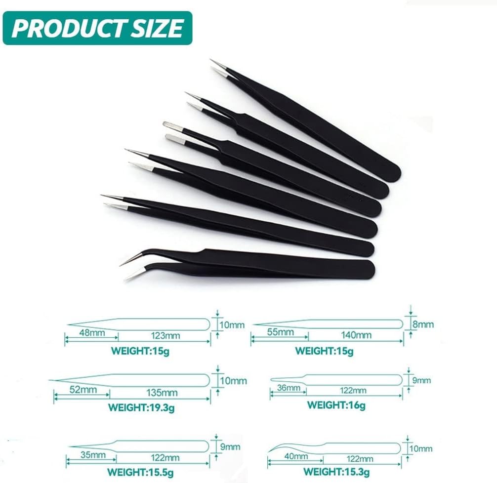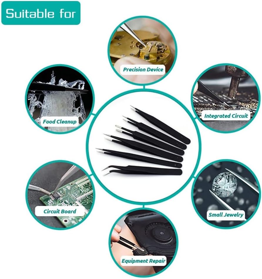 The tweezer is made by antacid steel, big strength factor,anti-static,good elasticity,antimagnetic.It's safe to pick up electronic components.High hardness and high elasticity,clamping small parts, not easy to deformation.Easily grip objects, Good texture, clamping accuracy 100 microns.The tweezers with a cover, which is not easy to damage the hands and is convenient for storage.Application: integrated circuit maintenance,precision parts maintenance,mobile phone accessories maintenance,computer parts maintenance,Eyelash curler.Specification Material:StainlessSteel Color: BlackFeature:elasticity,antimagnetic.It's safe to pick up electronic componentsQuantity: 1 Set 6 pieces)Hard material makes you easy to trim eyebrow shape