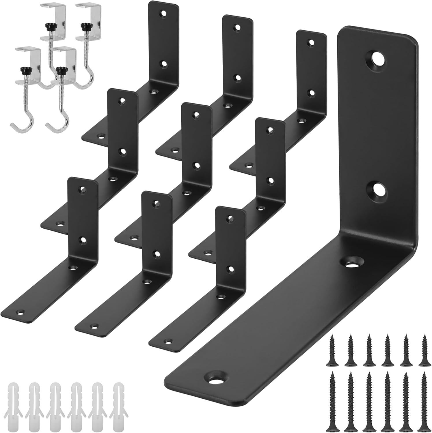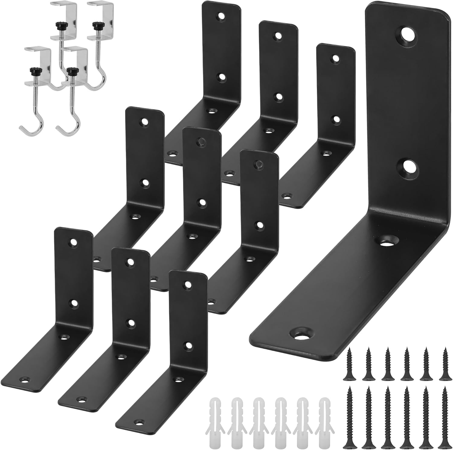 • Package Includes: You will receive 20 matte black L-shaped brackets and matched mouting screws, 4 adjustable hooks. L-shaped Brackets Size: L 5" x H 4" x W 1.5"