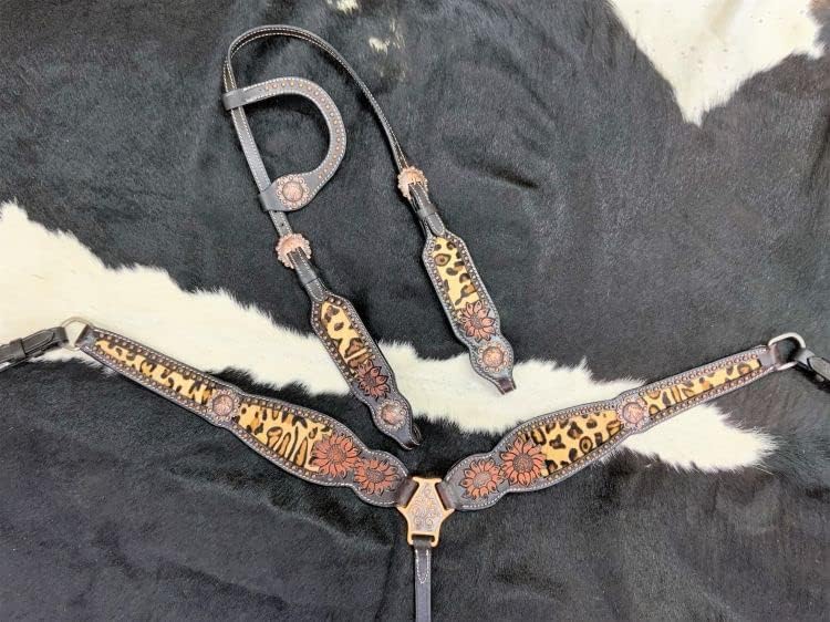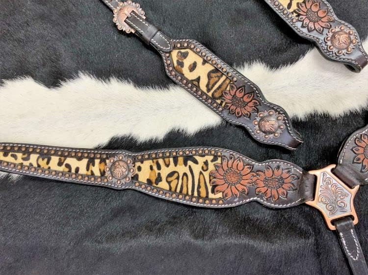 Showman Hair-on Cheetah Inlay Single Ear Leather Headstall & Breast Collar Set. This dark leather single ear set features a hair-on cheetah print inlay with tooled sunflowers, copper studs, and barrel racer conchos. Set includes 5/8" x 7' leather split reins. For an average full size horse.