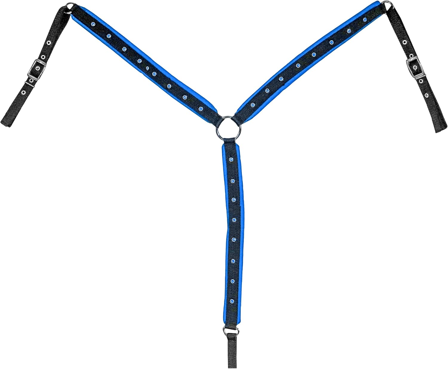 A headstall is an essential piece of tack for Western-style horseback riding. This sturdy headstall is designed to provide maximum control and comfort for your horse during training, trail rides, or competitions. Crafted from high-quality synthetic, it features intricate stitching and decorative accents that add a touch of Western flair. The adjustable noseband and throatlatch ensure a secure yet comfortable fit, while the browband helps distribute pressure evenly across the horse's head. With its durable construction and stylish appearance, this headstall is a practical and fashionable choice for any Western rider. Western Saddle Headstall Breast Collar Reins Horse Tack Set Barrel Racing Crystal Show Synthetic Nylon This nylon tack set is sure to be a perfect addition to your tack collection! This set features crystal accents that add a pop of bling in the show ring. Tack Set Specifications: Double Stitched Nylon Crystal Accents Stainless Steel Hardware Set Includes : Headstall, Breast Collar and reins Sizes Available : Full & Cob