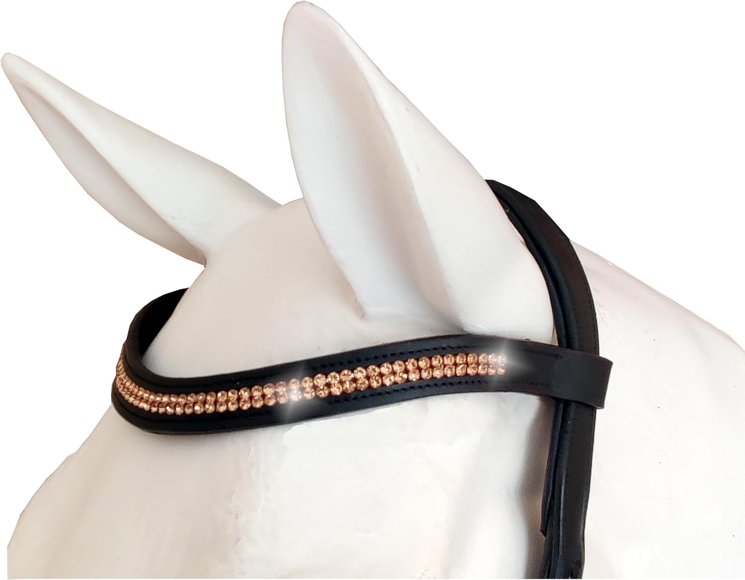 It's time to add a touch of class to your bridle with this curved leather browband featuring dazzling simulated crystals by Hunters Saddlery. Hand-crafted from soft, supple leather, there's no better way of enhancing the look of your horse’s bridle instantly.The eye-catching, anatomical curved design with two rows of rose gold diamante simulated crystals - is sure to impress. The browband’s medium-deep curve follows the natural contours of your horse's forehead, minimizing pressure points, ensuring your horse’s comfort.ColorsAvailable colours: Black or brown leather. Both come with rose gold diamante crystals.SizesPony Size measures 14 inches (36 cm)Cob size measures 15 inches (38 cm)Full (Horse) size measures 16.5 inches (42 cm)Will fit bridles with crown / headpieces of up to 1.18 inch in width (3cm)