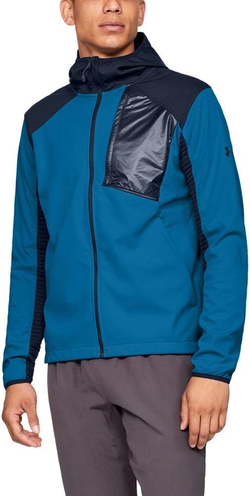 UA Storm technology repels water without sacrificing breathability. Windproof construction shields you from the elements. Stretch softshell fabric provides ultimate warmth & comfort without sacrificing durability. Double-knit insulation panels through back & sleeves retain warmth while being super breathable. Secure, zip hand & chest pockets.